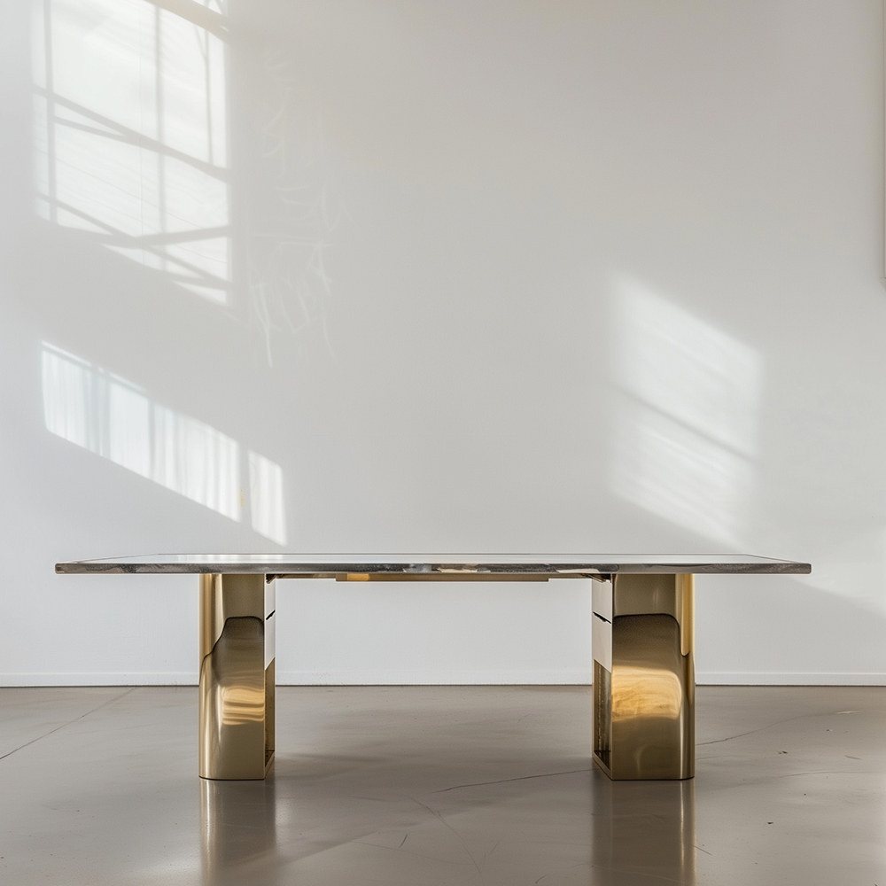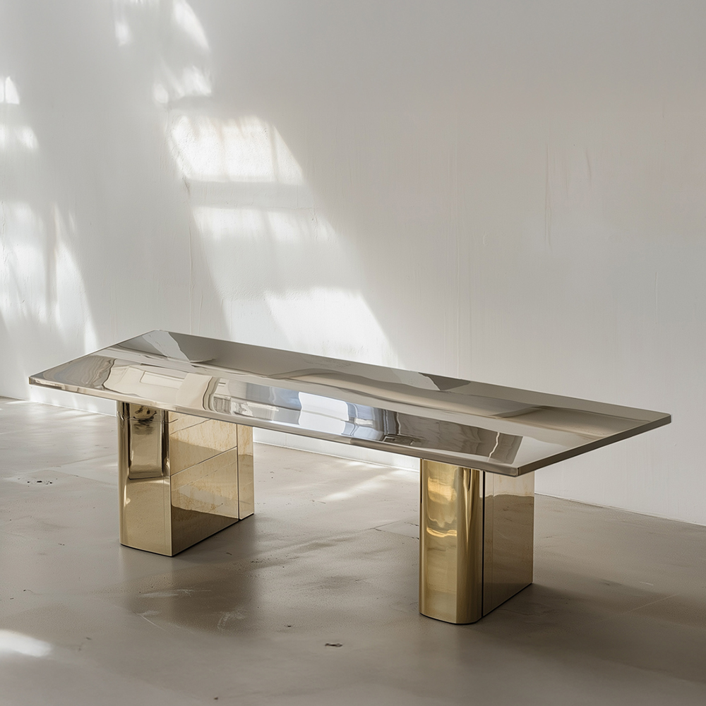 The Coexist Redux Desk explores the dialogue between contrasting metals through a bold, architectural form. A faceted polished stainless steel top reflects its surroundings with a fluid, mirror-like quality, while the brass pedestal bases ground the piece with warmth and weight. The composition feels both precise and expressive, balancing sharp geometry with soft reflections.