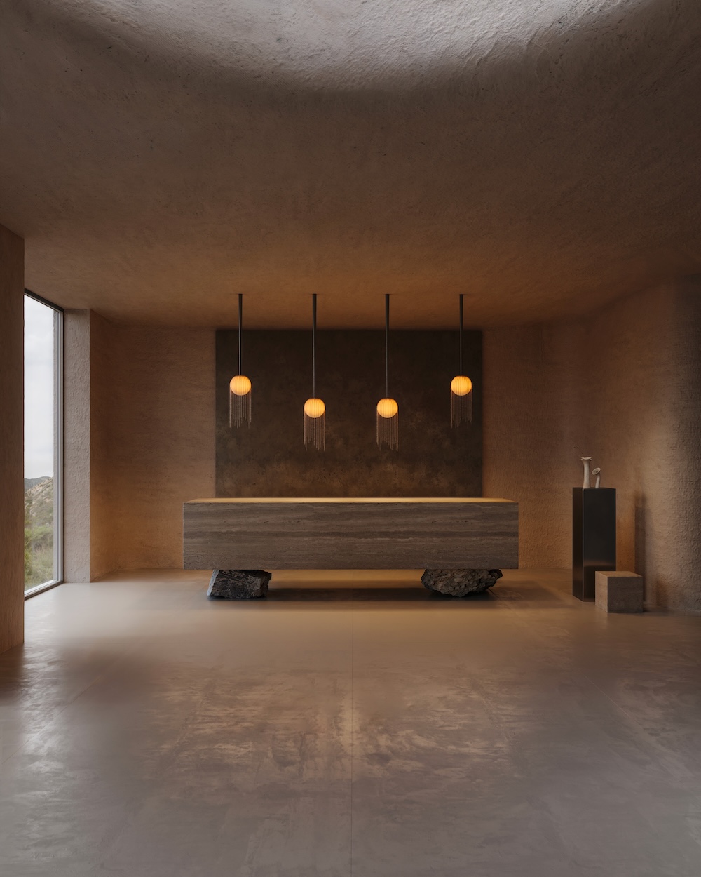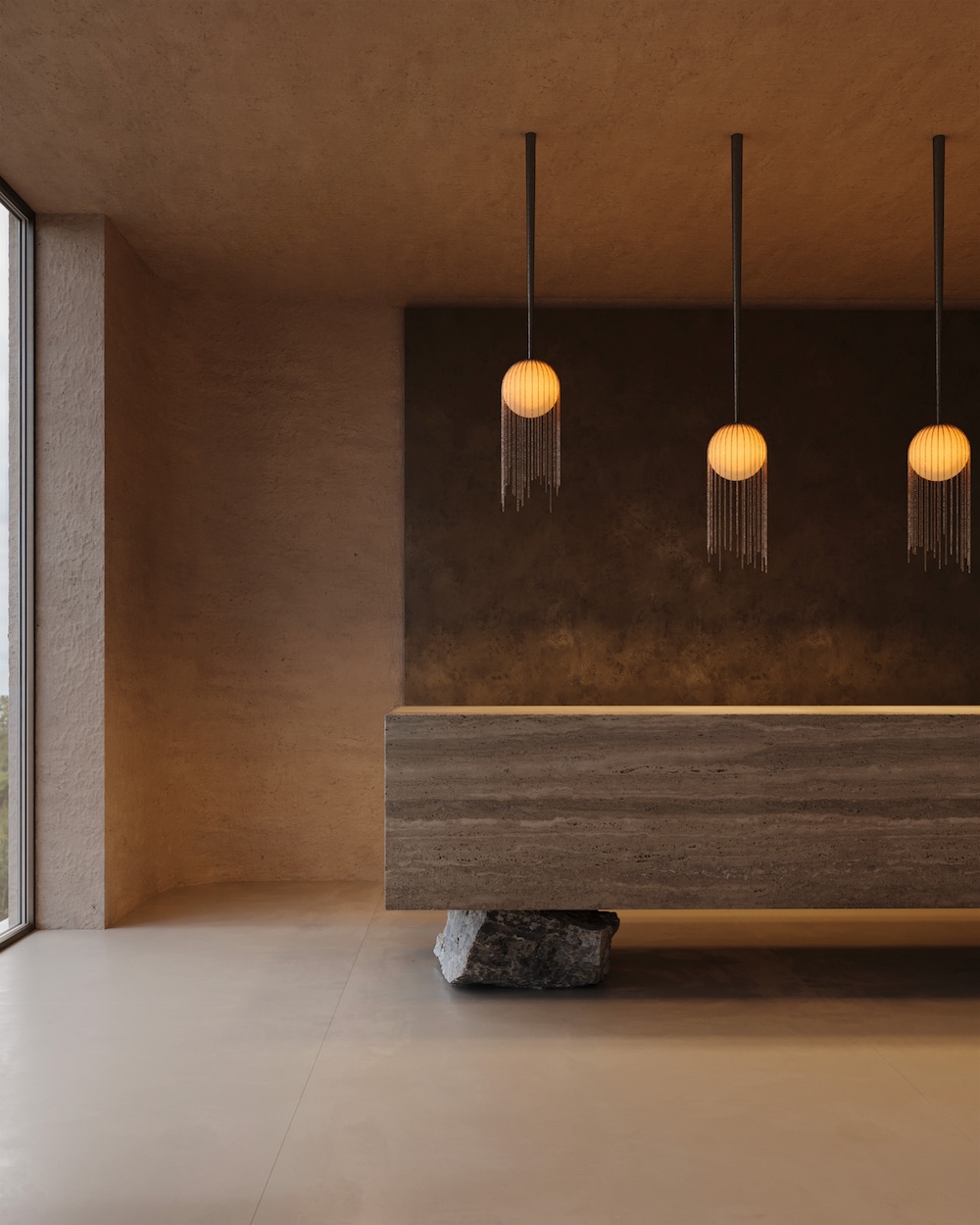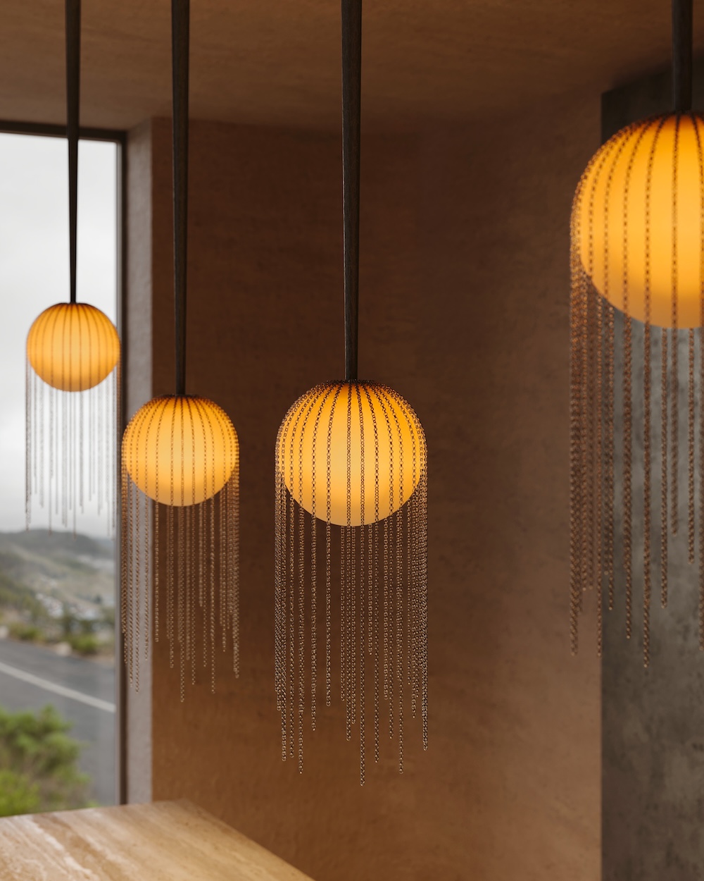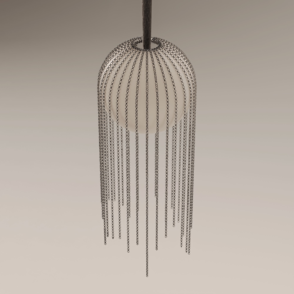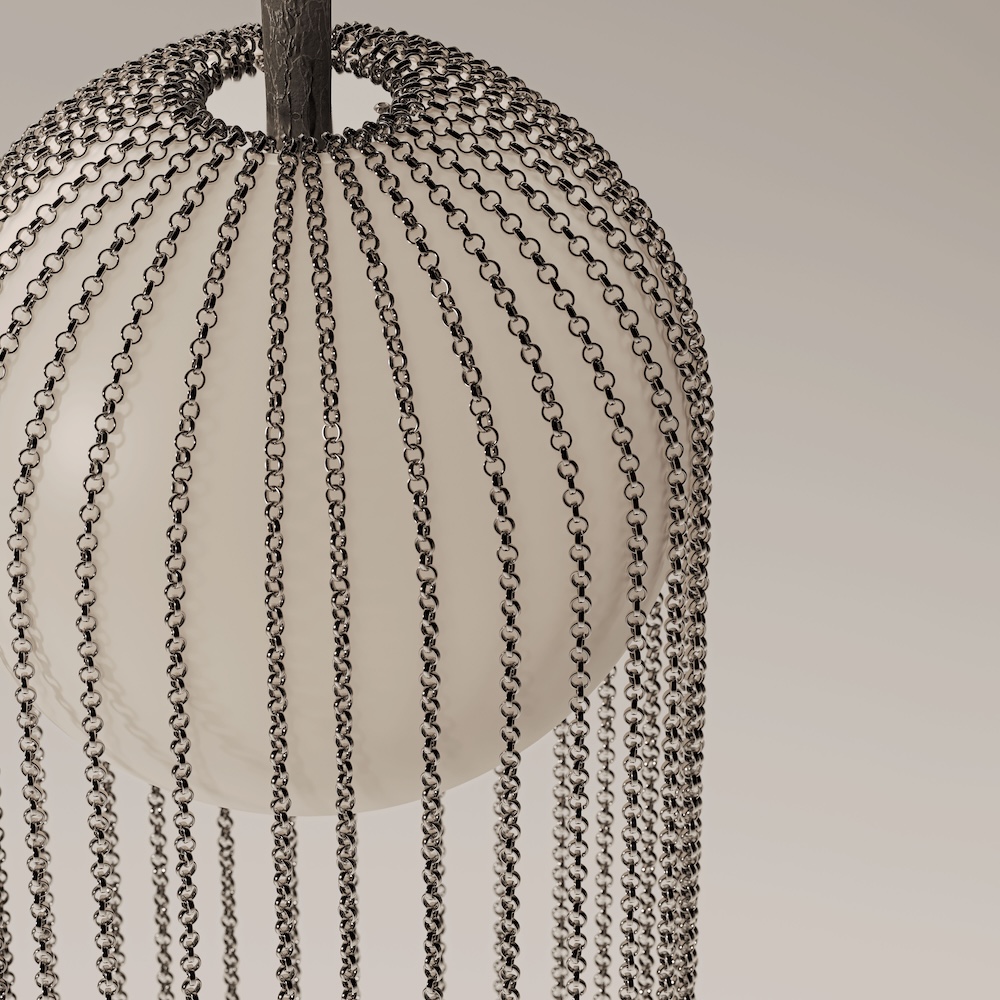 The Comete pendant is a delicate composition of form and movement, where a softly diffused glass sphere anchors a cascading series of fine metal chains. The contrast between the smooth opal glass and the textured, hand-finished metal creates a quiet sense of balance, while the elongated silhouette brings a sense of verticality and lightness to the space.