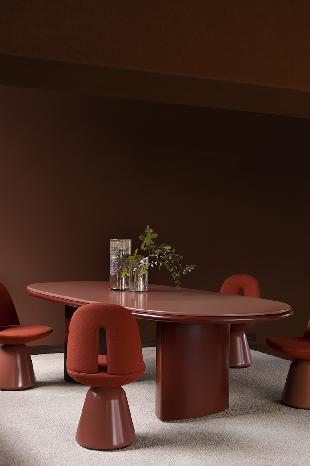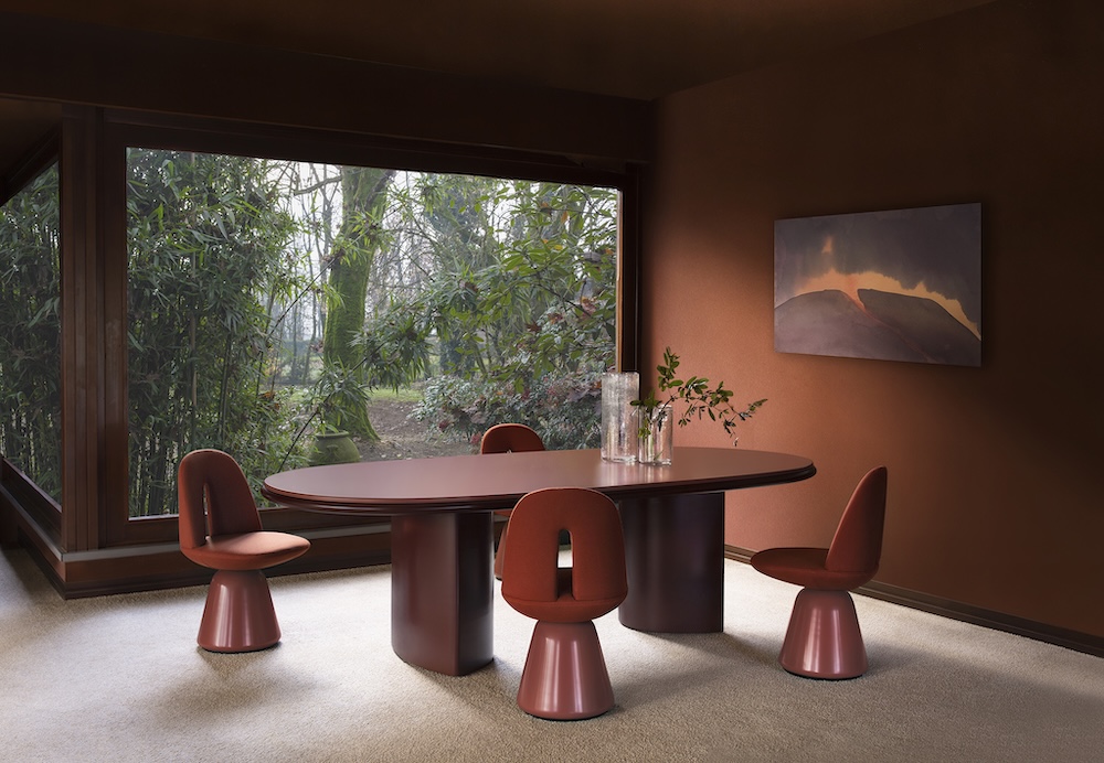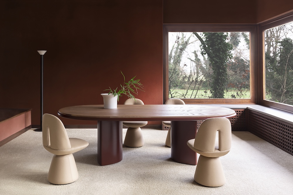 The Double L Dining Table by Simone Bonanni for Carpanese Home features a sculptural double base arranged at varying distances to adapt to different top sizes. Its design aspires to a geometric order while exploring the perception of volumes and their dialogue within space. The oval top is available in a range of finishes including ash, lacquer, marble, and porphyry stone, with legs offered in ash or lacquered wood. The result is a piece that combines generous volumes with gentle, refined forms.