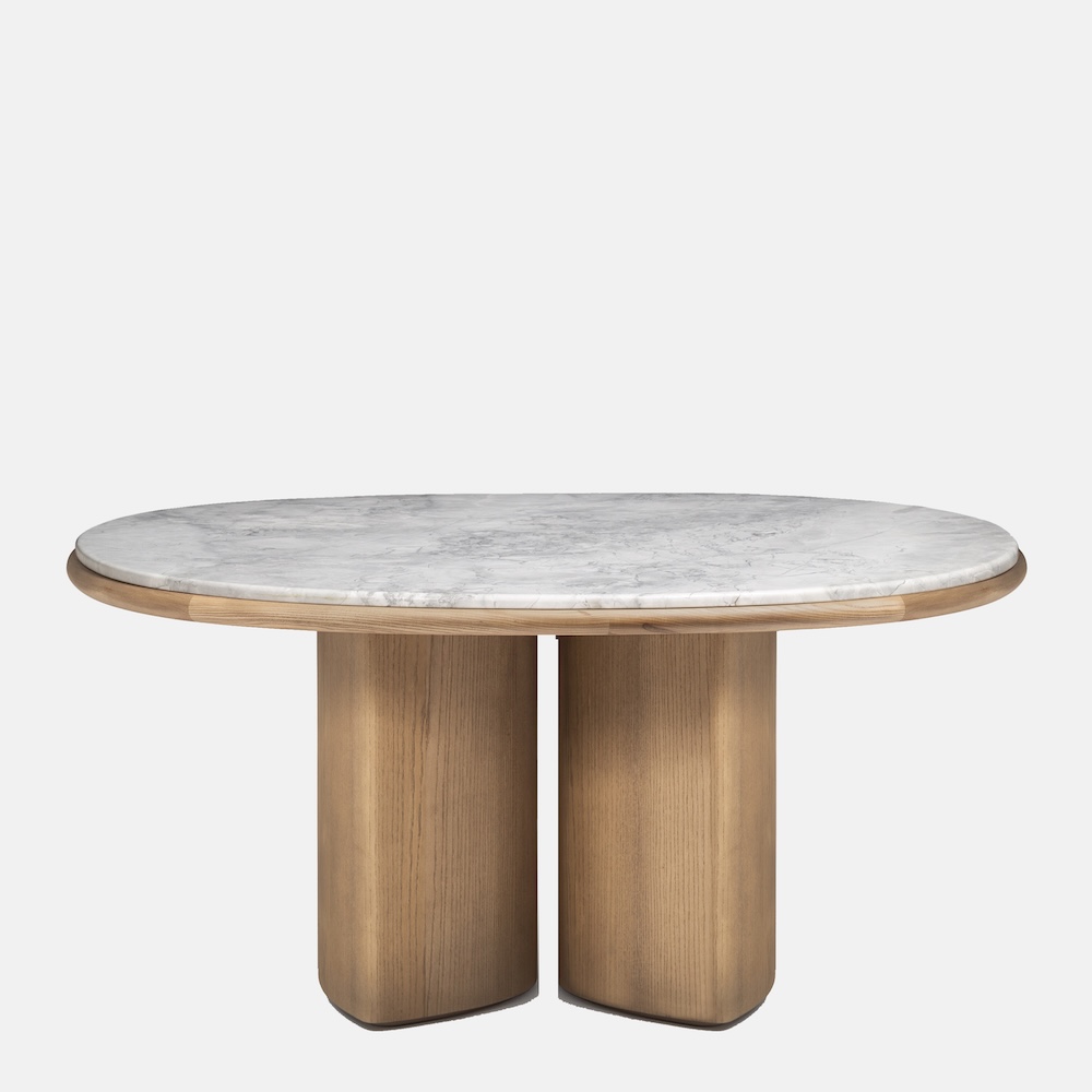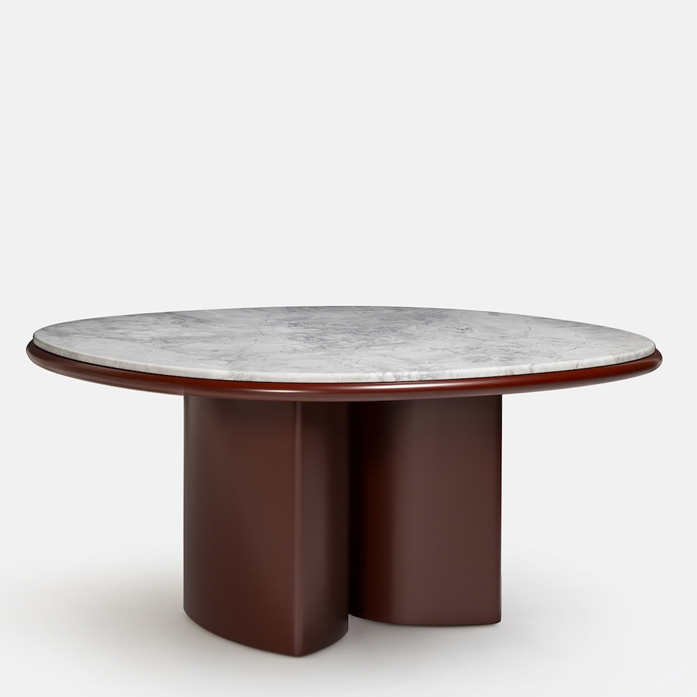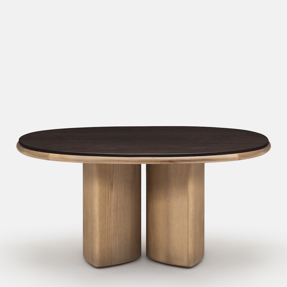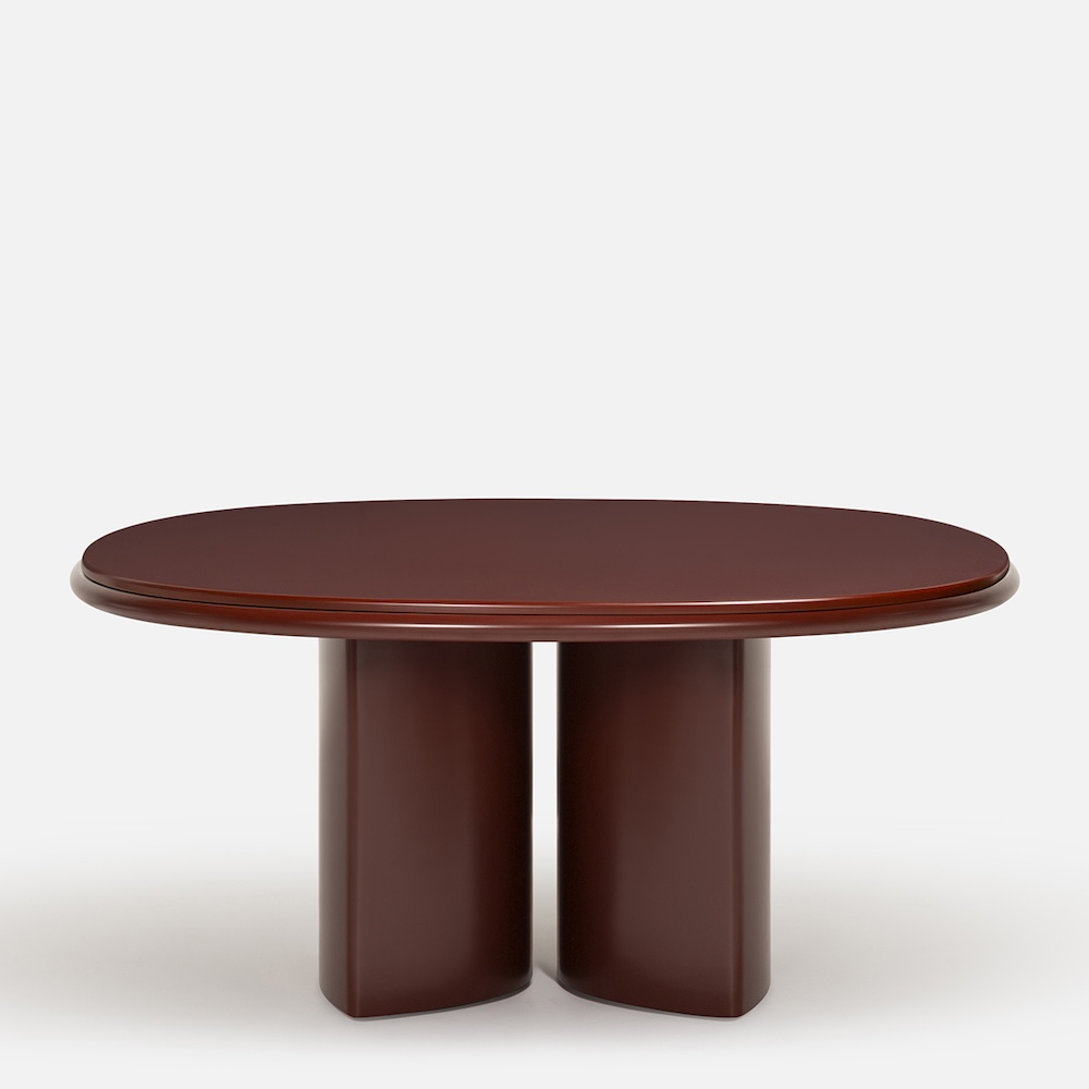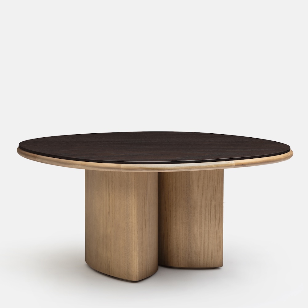 The Double R Dining Table by Simone Bonanni for Carpanese Home is defined by two sculptural bases placed side by side, creating the effect of a single piece that supports the round tabletop. Balancing geometric precision with softness, the table explores the perception of volumes and their dialogue within space. The round top is available in a range of finishes including ash, lacquer, marble, and porphyry stone, paired with legs in ash or lacquered wood. The result is a table that unites bold presence with refined gentleness.
