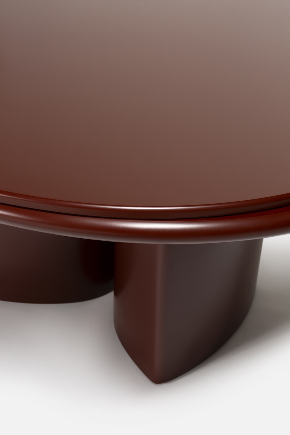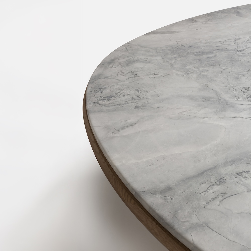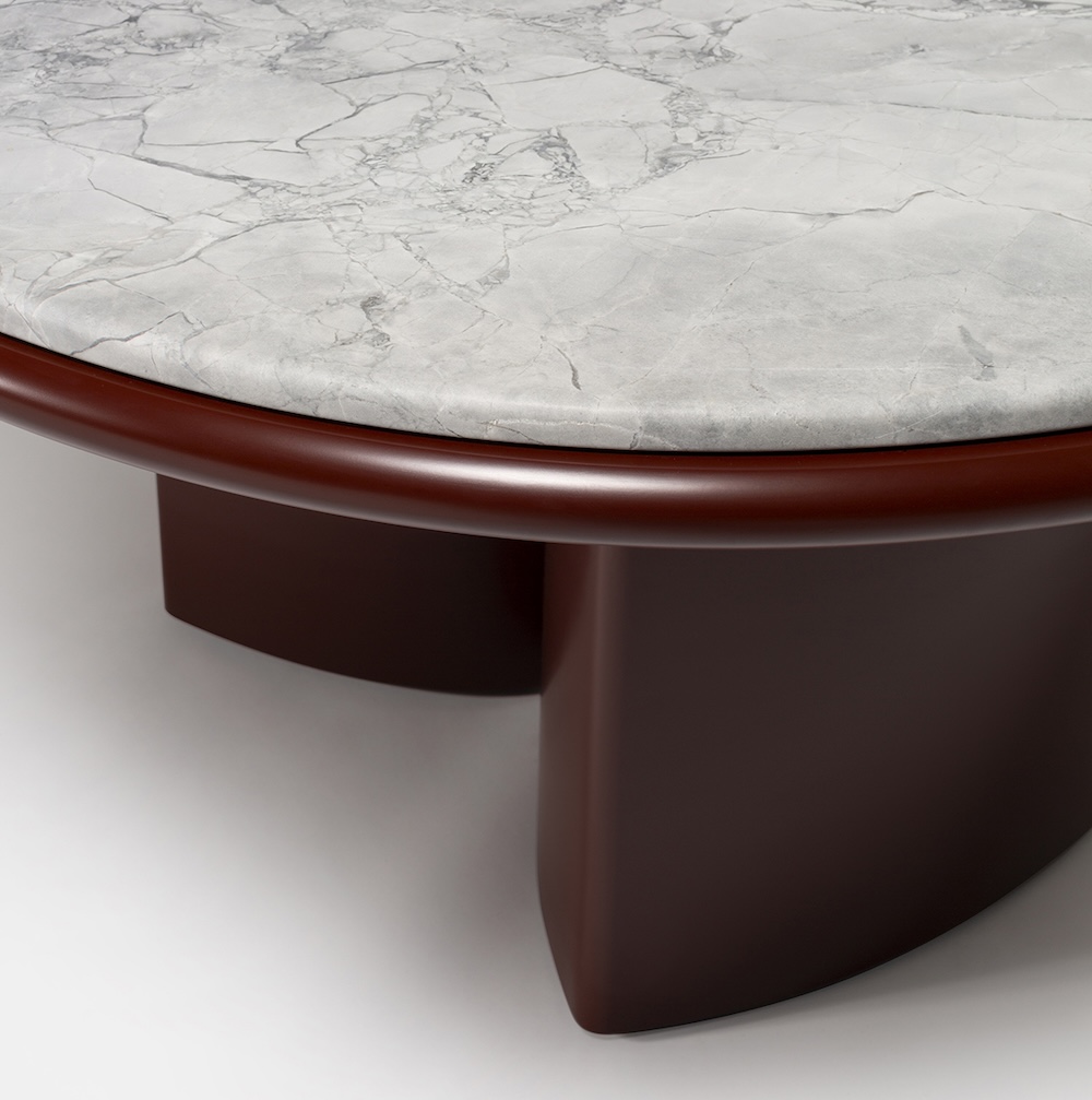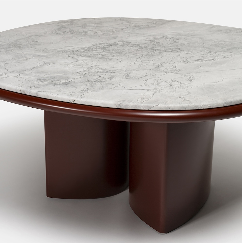 The Double R Dining Table by Simone Bonanni for Carpanese Home is defined by two sculptural bases placed side by side, creating the effect of a single piece that supports the round tabletop. Balancing geometric precision with softness, the table explores the perception of volumes and their dialogue within space. The round top is available in a range of finishes including ash, lacquer, marble, and porphyry stone, paired with legs in ash or lacquered wood. The result is a table that unites bold presence with refined gentleness.