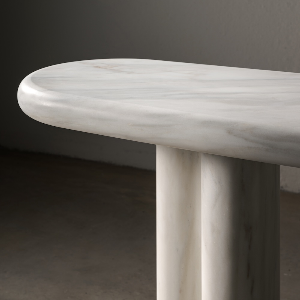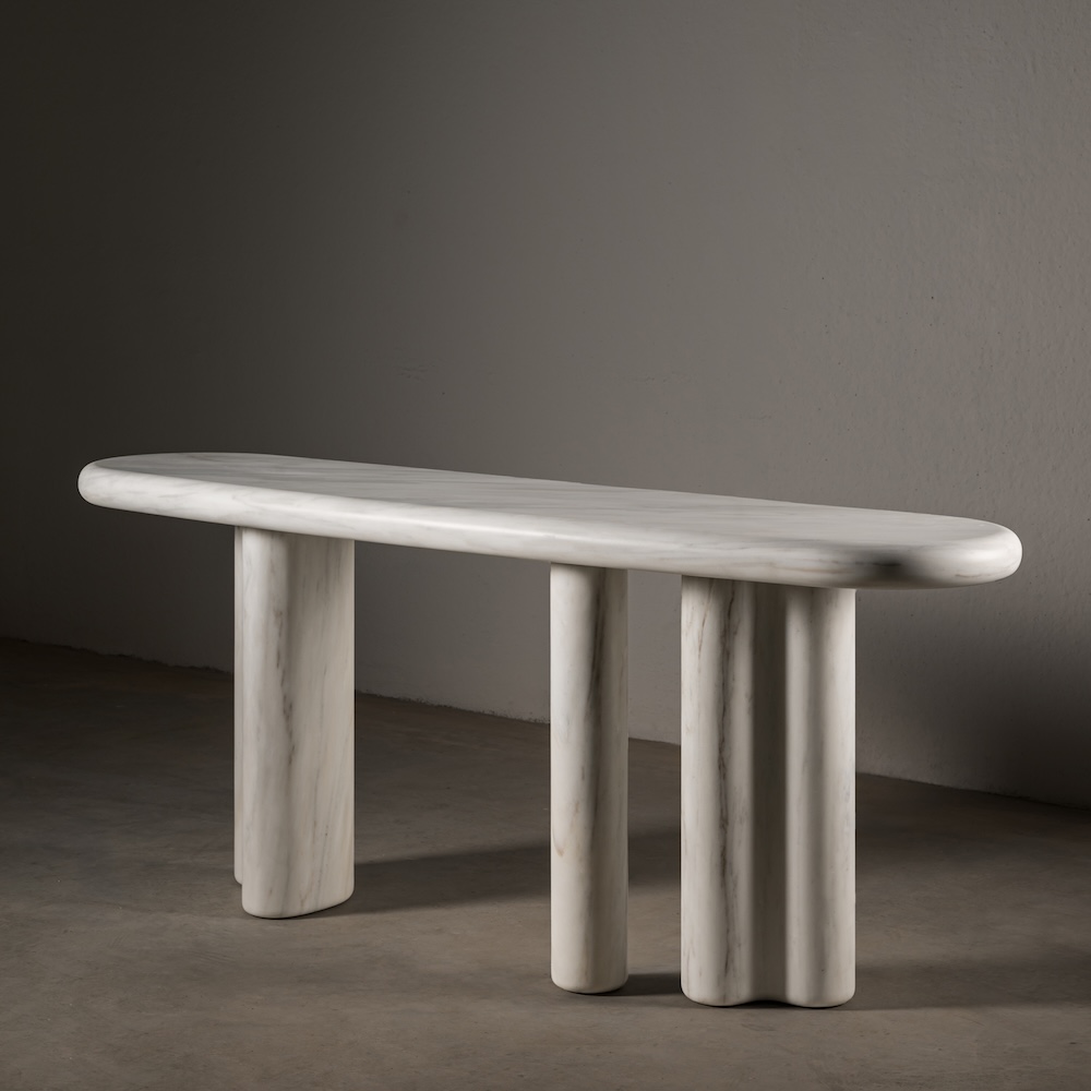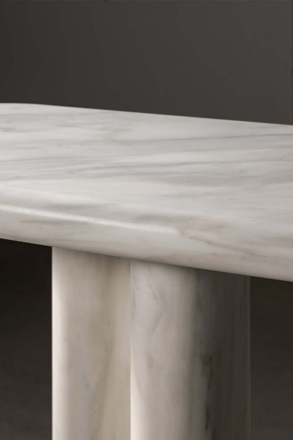 The Dune Console, by Chiara Provasiis, features marble sculptures for the home, defined by bold and imposing forms with soft, sinuous lines inspired by desert dunes. Each piece is shaped as if softened by wind over time, creating a tactile contrast between the hardness of marble and the artisanal softness of craftsmanship. The natural color variations of each block of marble make every object in this collection unique and unrepeatable.
