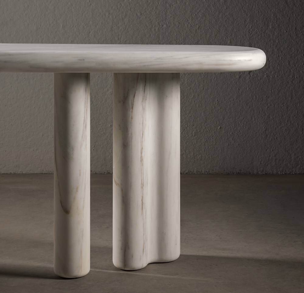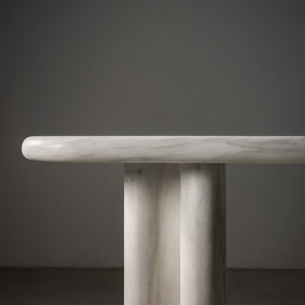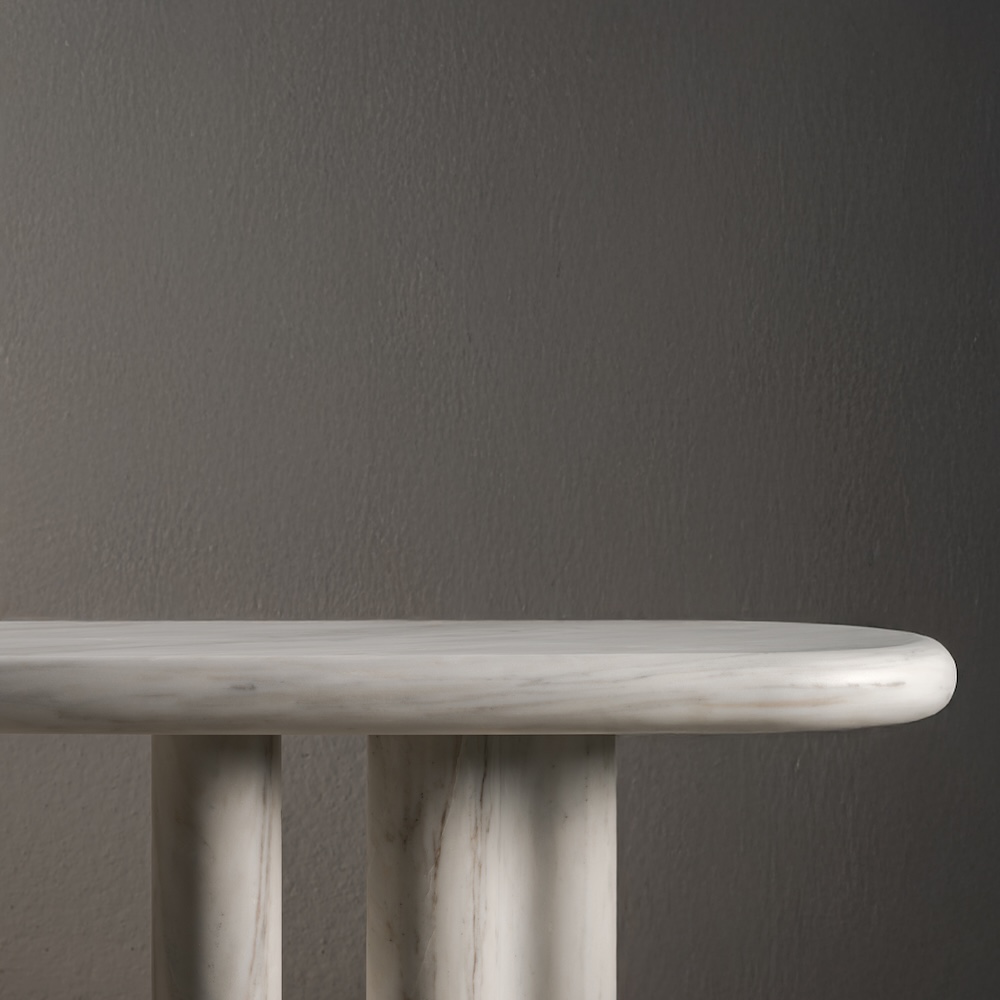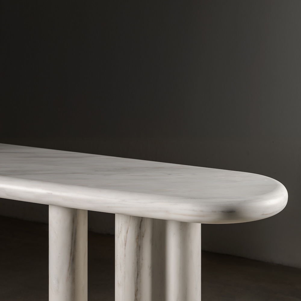 The Dune Console, by Chiara Provasiis, features marble sculptures for the home, defined by bold and imposing forms with soft, sinuous lines inspired by desert dunes. Each piece is shaped as if softened by wind over time, creating a tactile contrast between the hardness of marble and the artisanal softness of craftsmanship. The natural color variations of each block of marble make every object in this collection unique and unrepeatable.