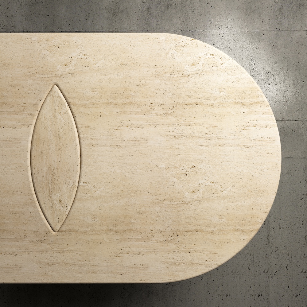 The Eclipse collection, designed by Giorgio Bonaguro, explores the balance between sculptural form and functional design. This dining table features two bold central marble legs that support an elongated oval top, emphasizing both stability and elegance. The softened edges and clean geometry highlight the natural beauty of the stone, while the central base design allows for generous seating and a refined architectural presence.