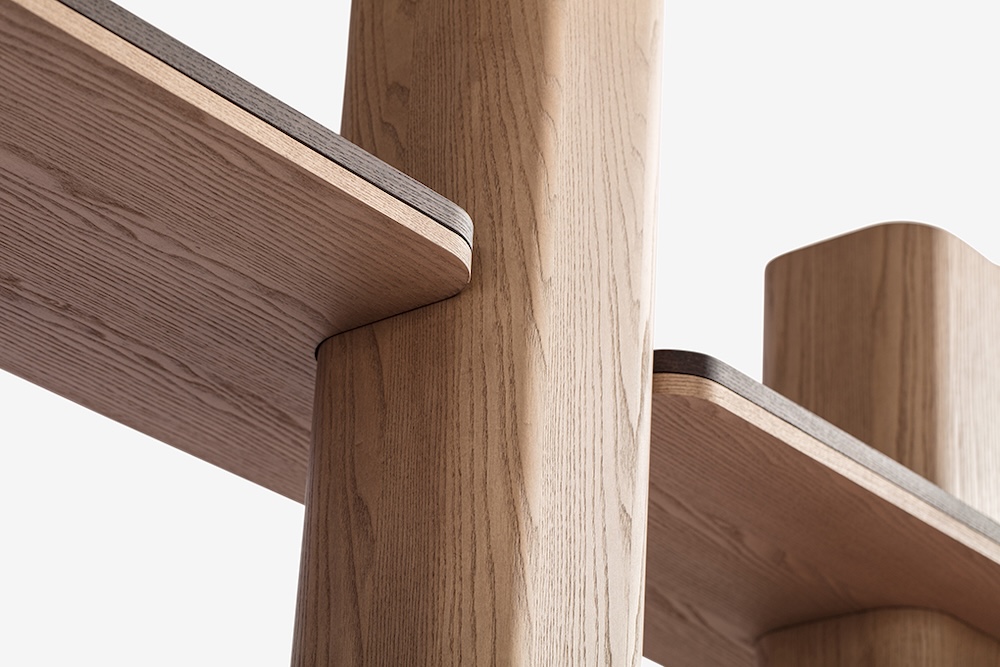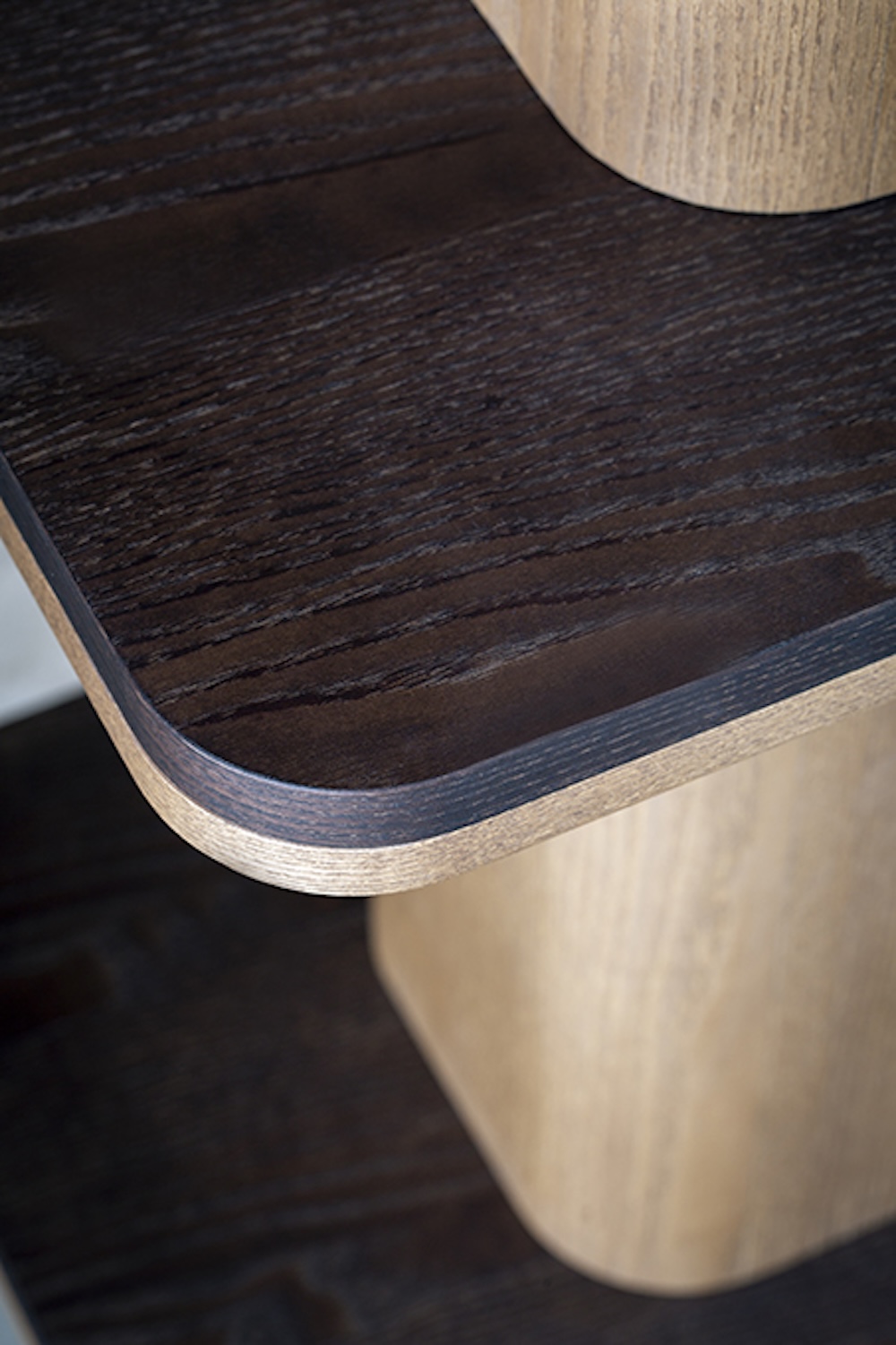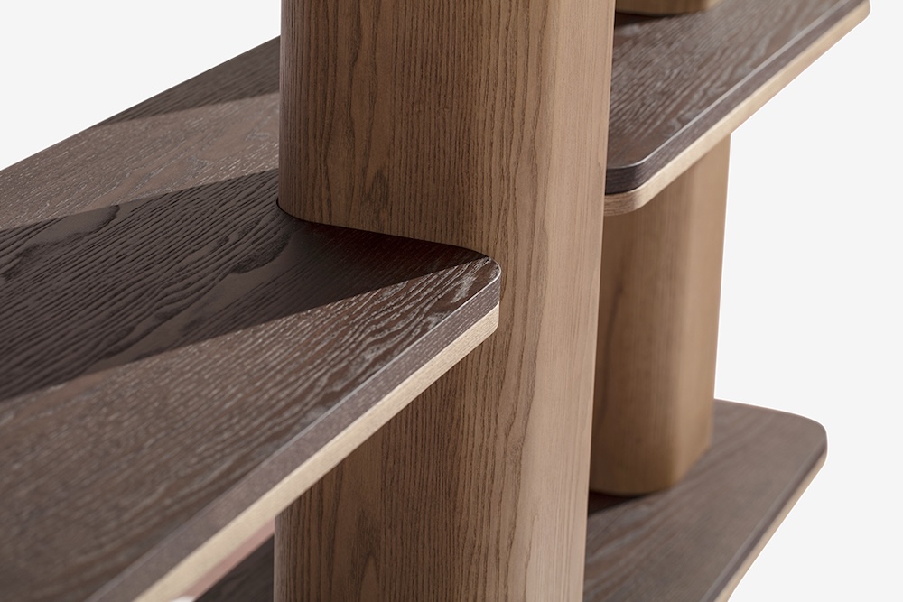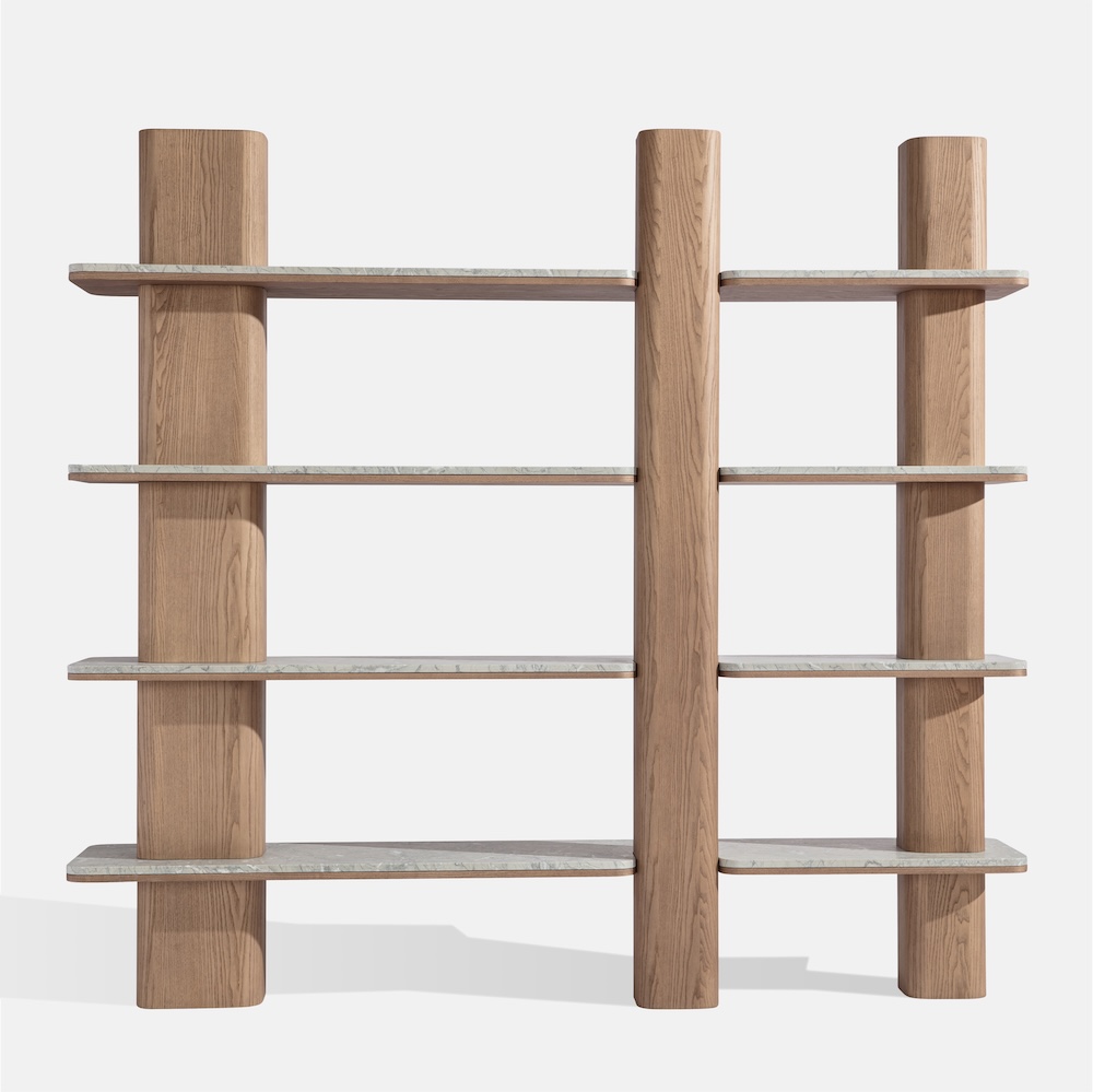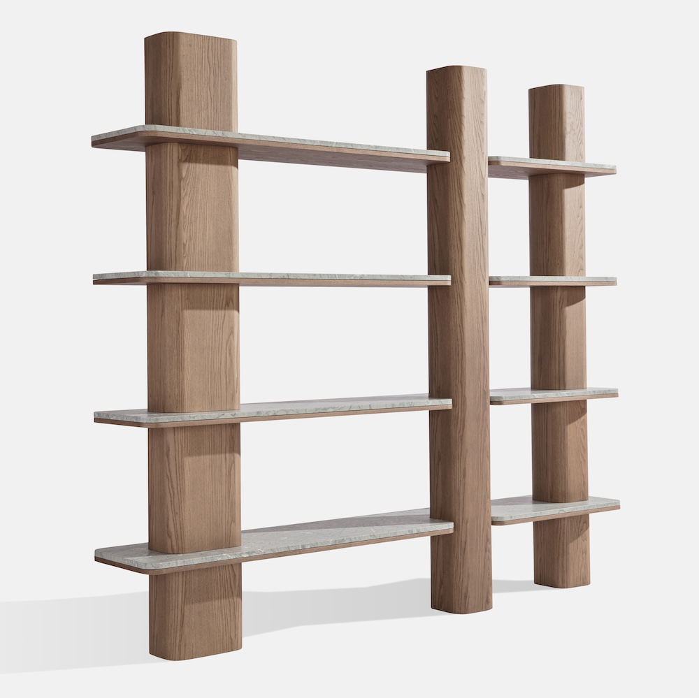 The Erice L Bookcase wall by Giorgio Bonaguro for Carpanese Home continues the Erice collection, designed with the same sculptural language as the coffee and console tables. Its structure is entirely crafted from solid wood, with shelves available in either marble or wood, supported by ash understructures. The design reflects the interlocking rhythm of cyclopean walls, where geometric connections and beveled details create a dynamic yet monolithic presence. With its generous scale and striking sculptural character, Erice L functions as both a practical storage solution and a bold architectural statement, making it ideal for living spaces, studies, or transitional areas.
