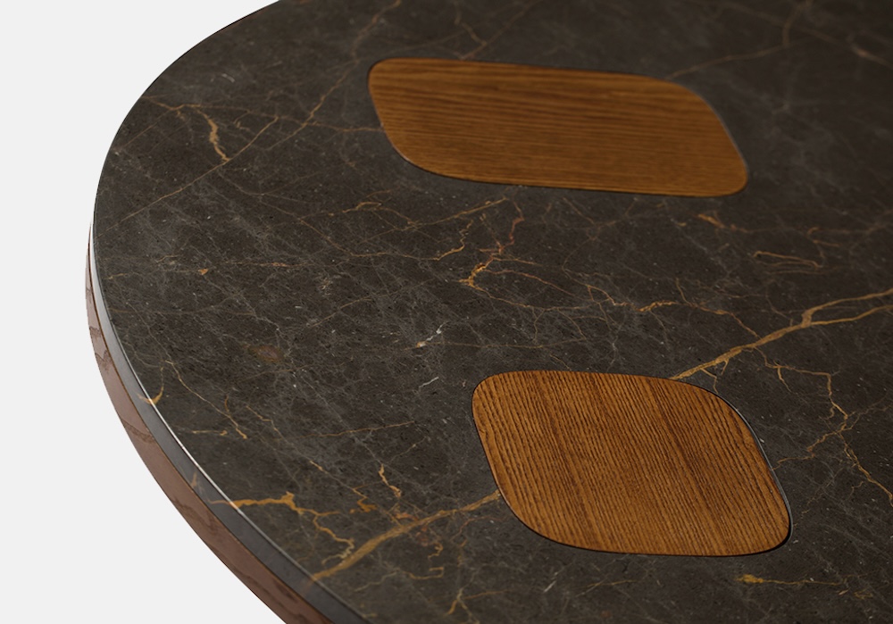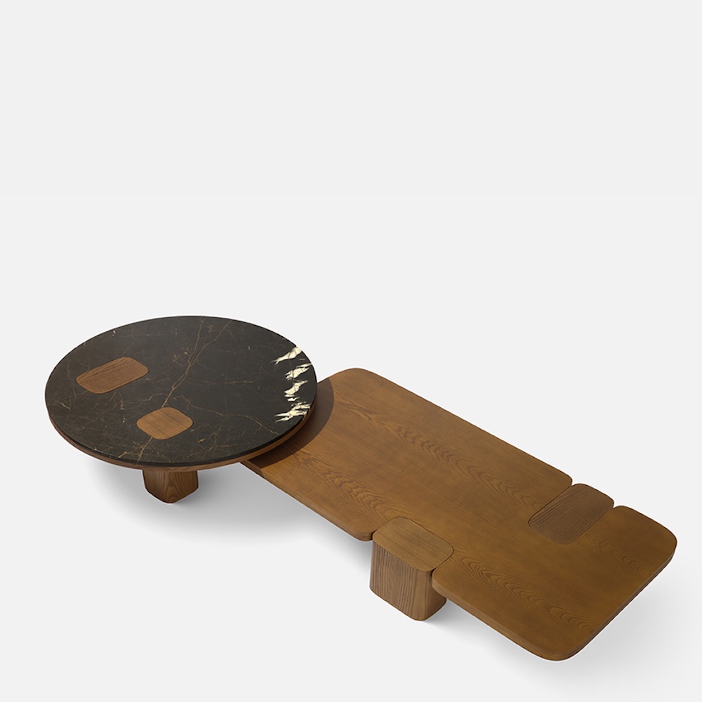 The Erice table collection blends refined geometry with a strong material presence. Available with either a marble or wooden top, each piece is anchored by sculptural bases and accented with inset details that highlight craftsmanship and contrast.