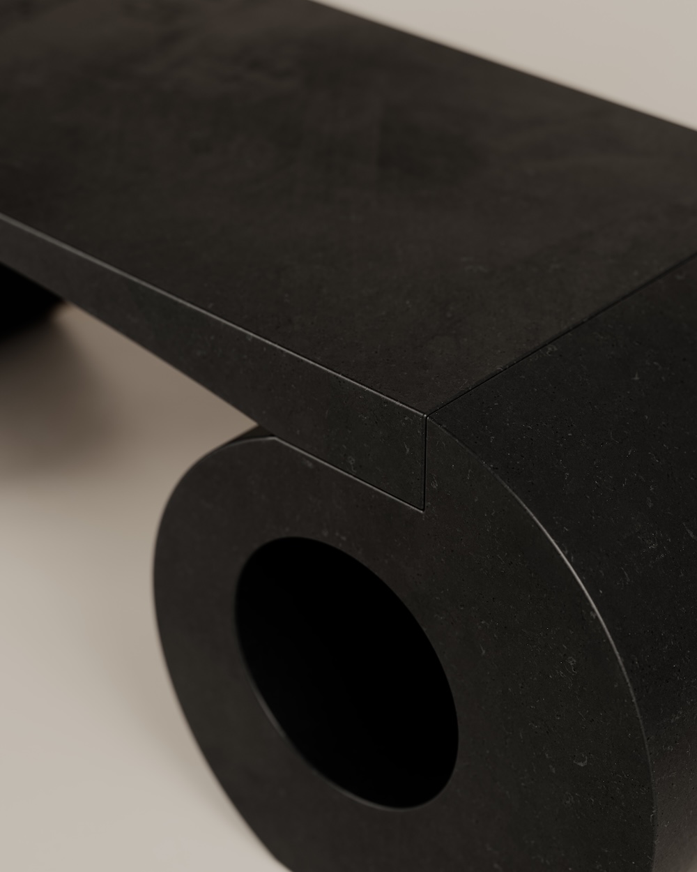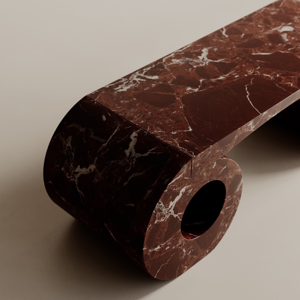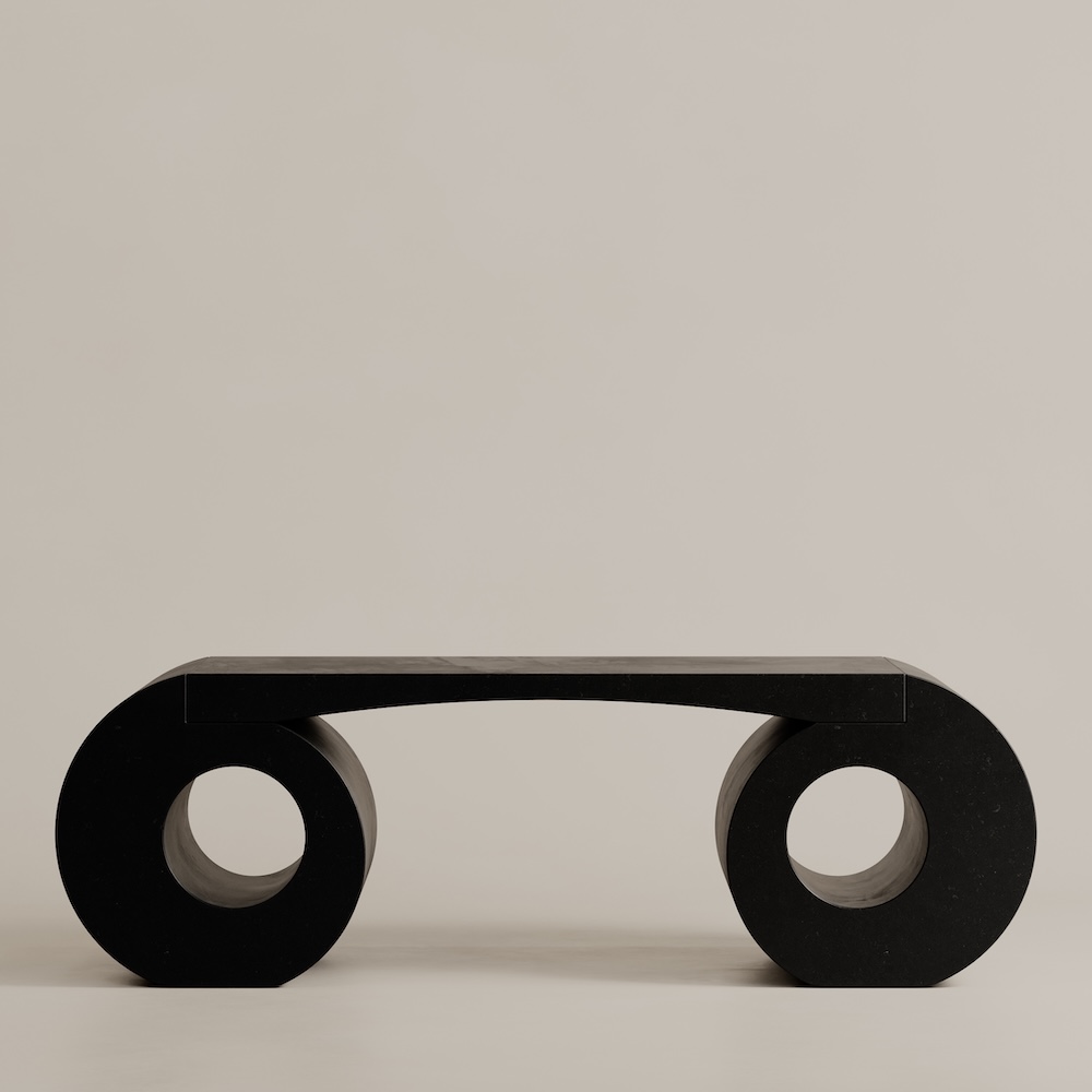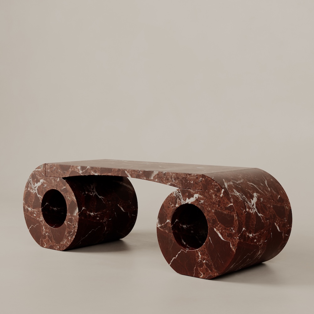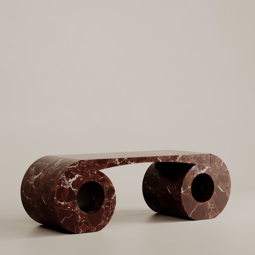 The Eye Bench is sculpted from rich marble, blending bold geometry with refined craftsmanship. Its circular supports and linear top create a striking balance of form and function, showcasing the natural veining and texture of the stone.