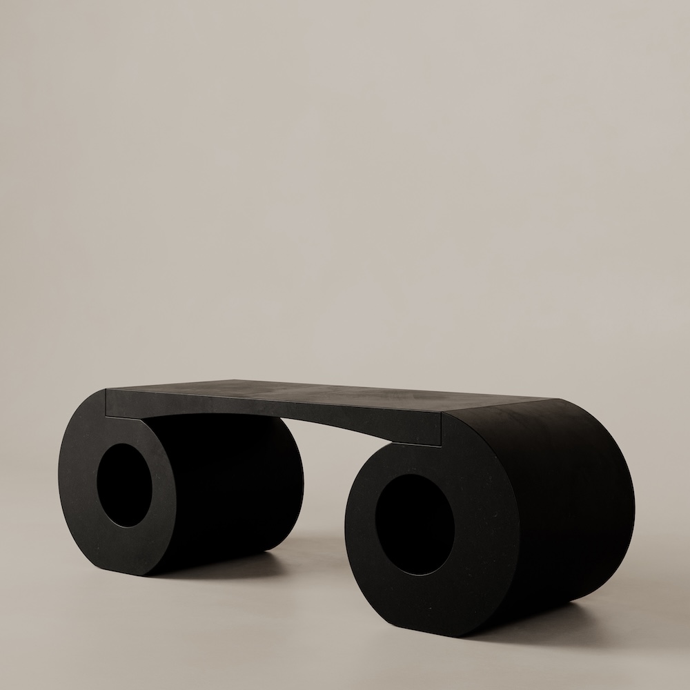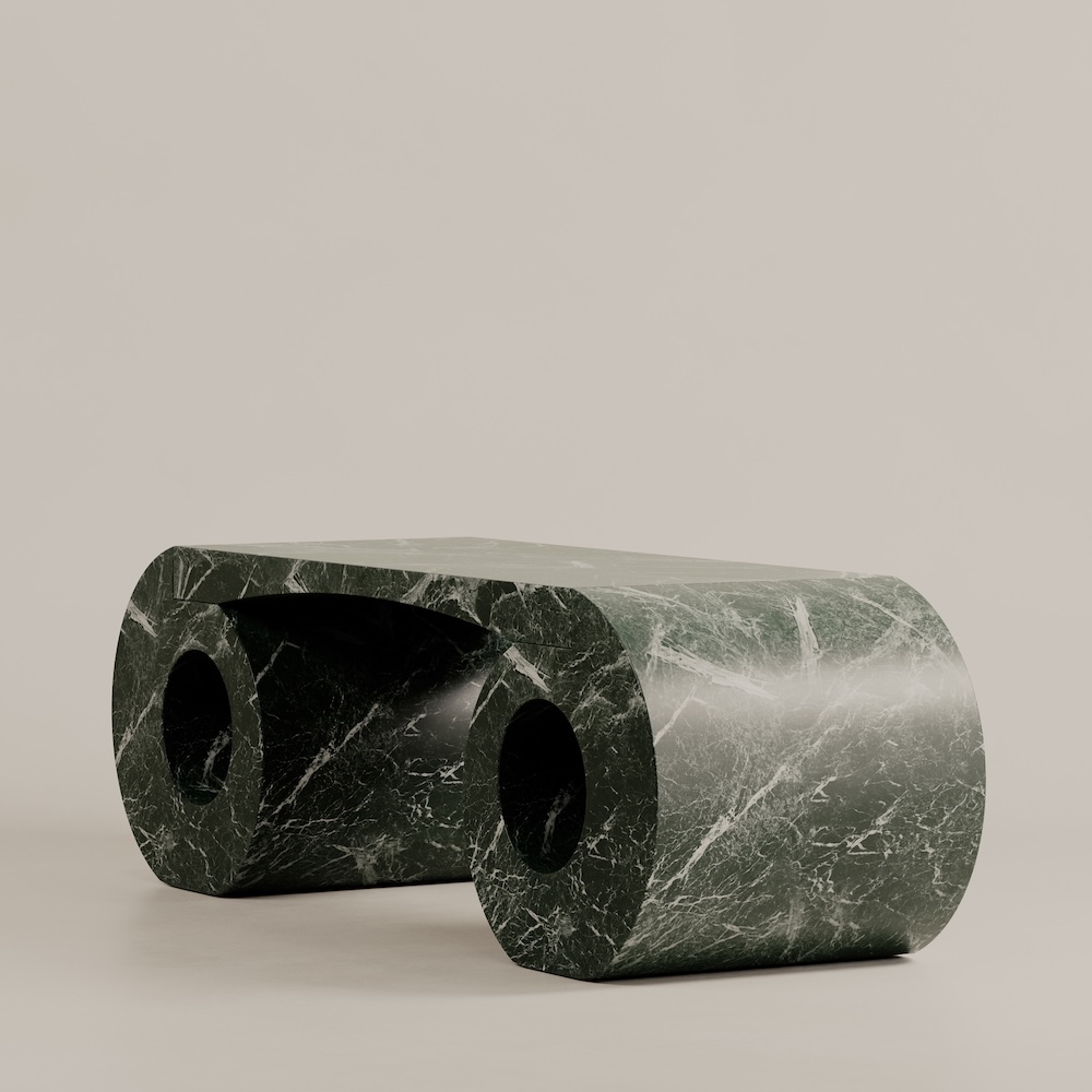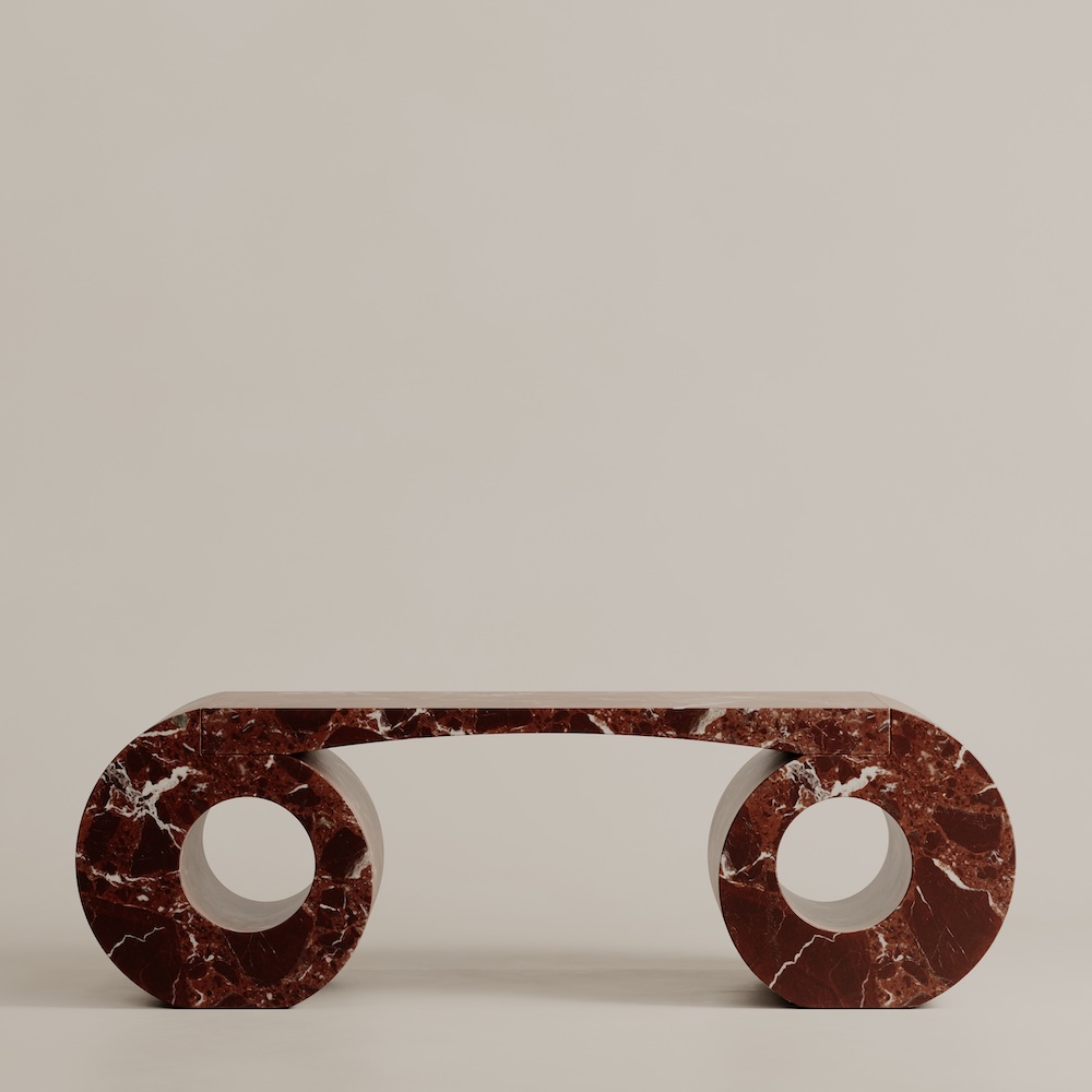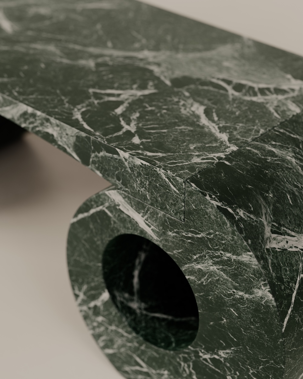 The Eye Bench is sculpted from rich marble, blending bold geometry with refined craftsmanship. Its circular supports and linear top create a striking balance of form and function, showcasing the natural veining and texture of the stone.