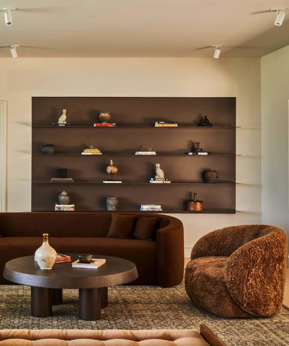 The Leslie Chair features a tall frame and rounded silhouette, upholstered in curled rust-hued shearling for a tactile and luxurious presence. With rounded arms and a swivel base, it functions beautifully as both a statement accent chair and a versatile lounge piece.