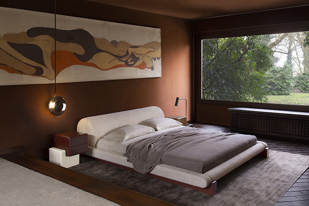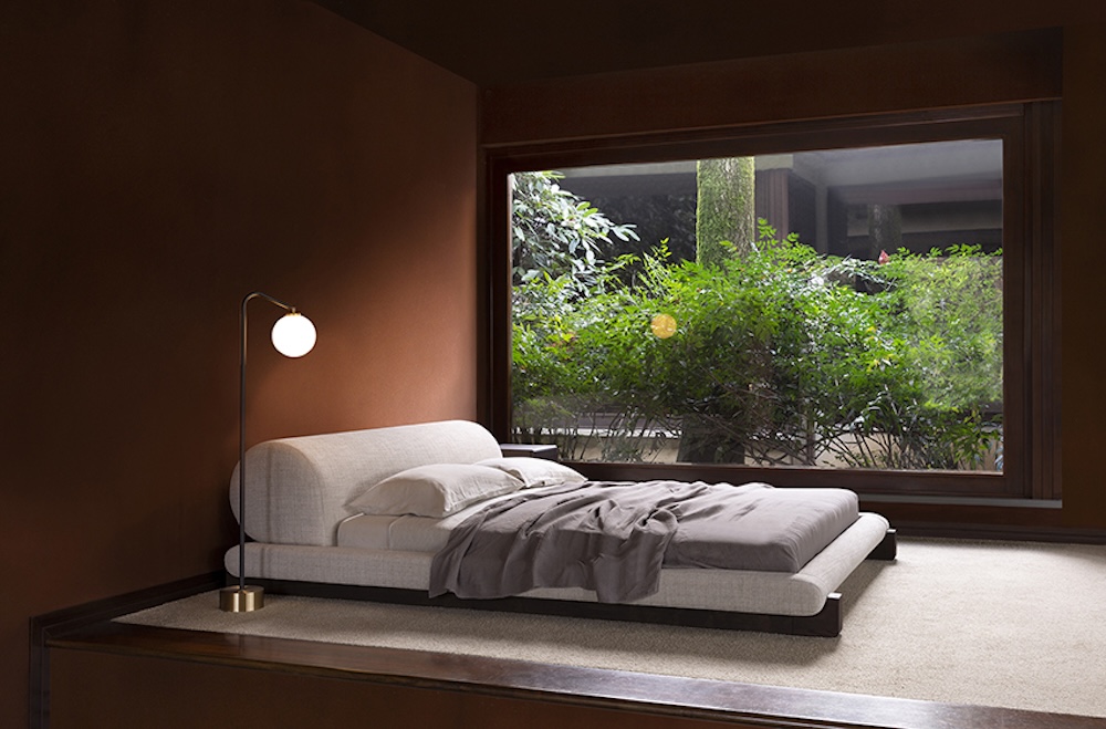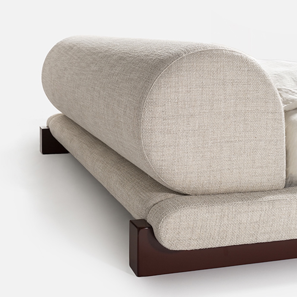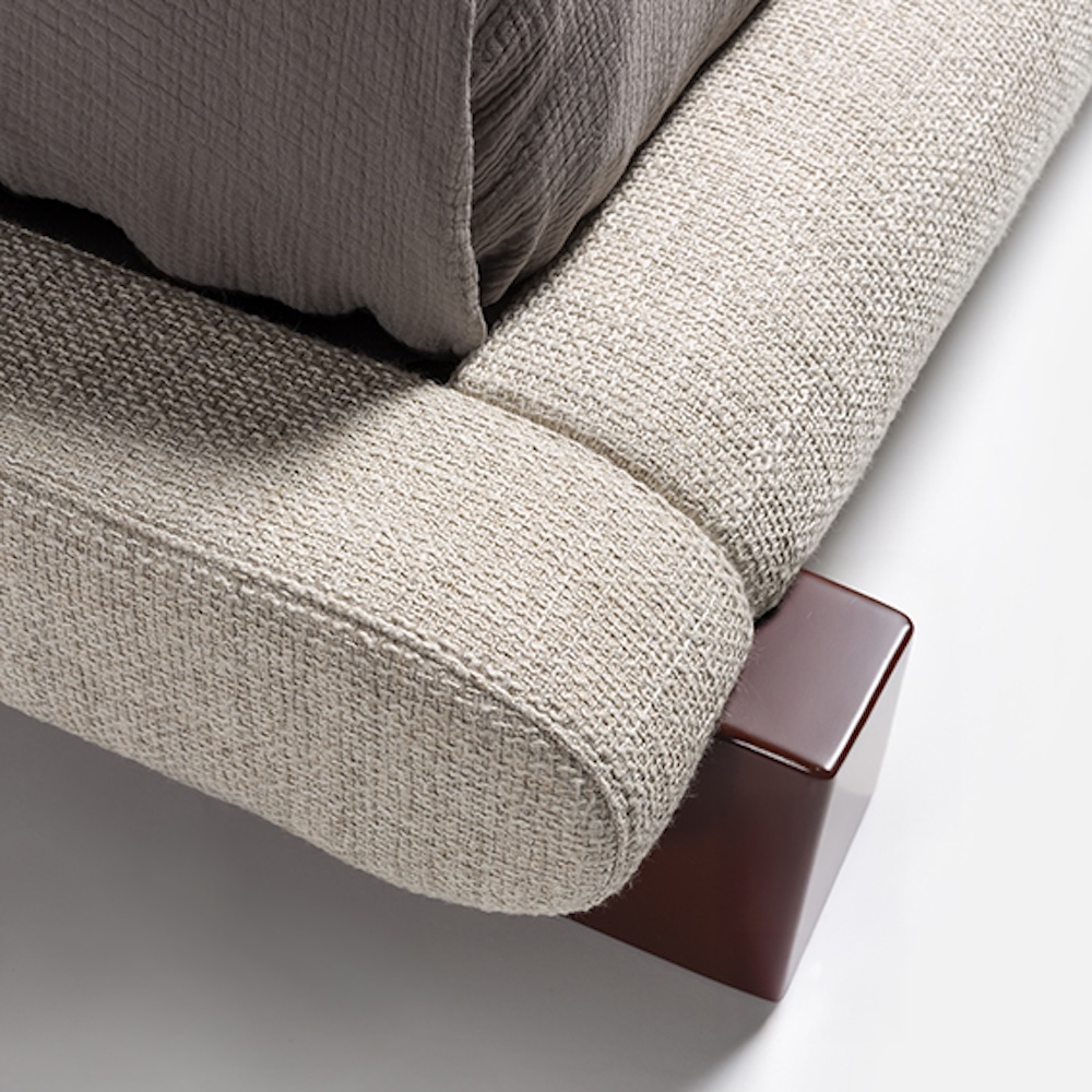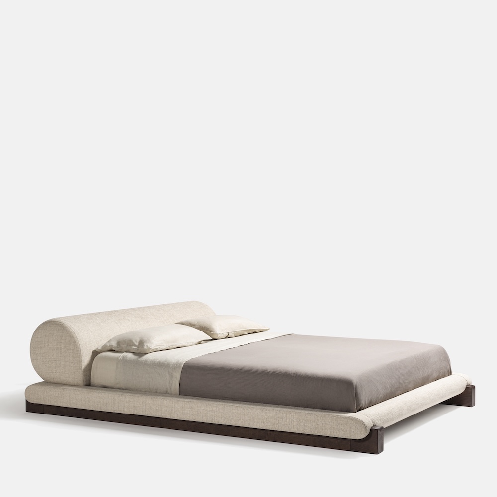 The Maki Bed by Simone Bonanni for Carpanese Home is a sculptural piece that plays on the contrast between the softness of its upholstered volumes and the precise geometry of its solid wood base. The upholstered headboard and base extend slightly beyond the mattress, while the perimeter frame redefines the sleeping area with a strong architectural gesture. Refined yet bold, Maki embodies the designer’s focus on graphic synthesis and the stylisation of simple forms.