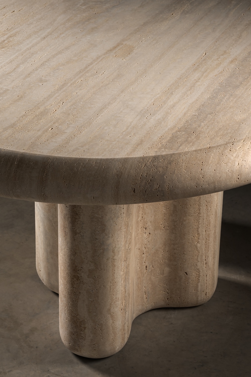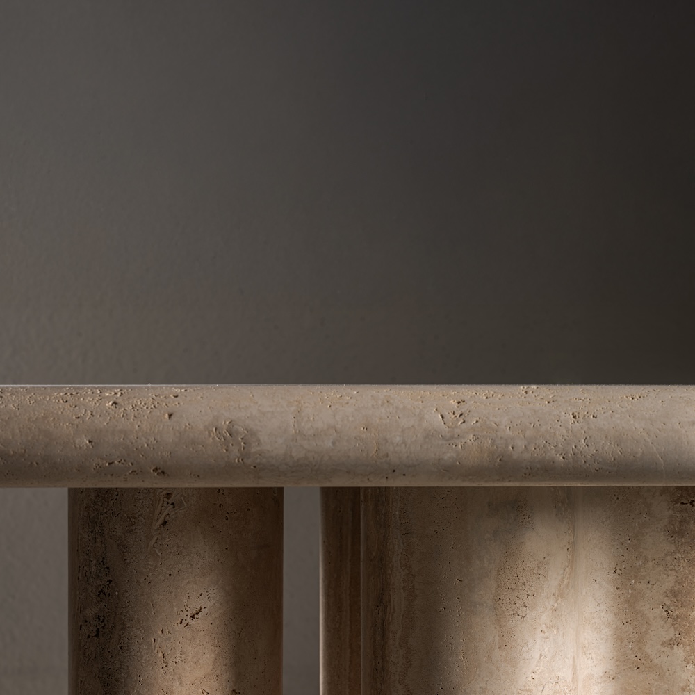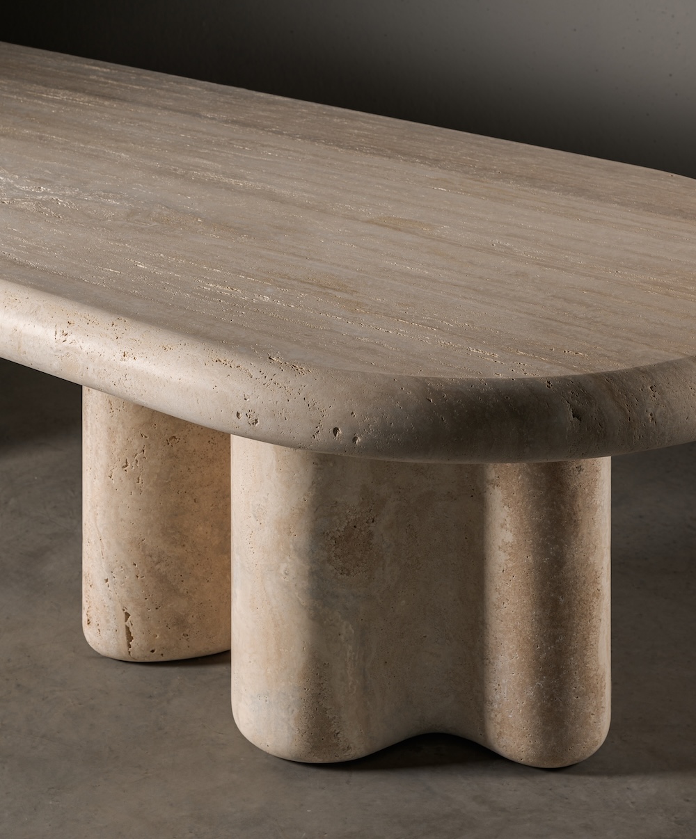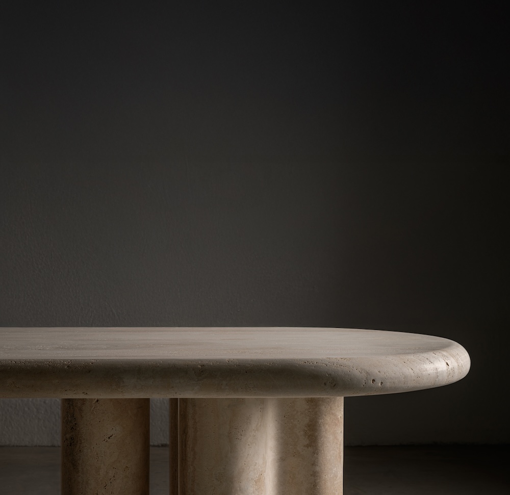 The Oval Dining Table, by Chiara Provasiis, crafted in solid travertine, pairing an elegant oval top with a sculptural columnar base. Its pure geometric form highlights the natural beauty of the stone while creating a timeless centerpiece for a dining space.