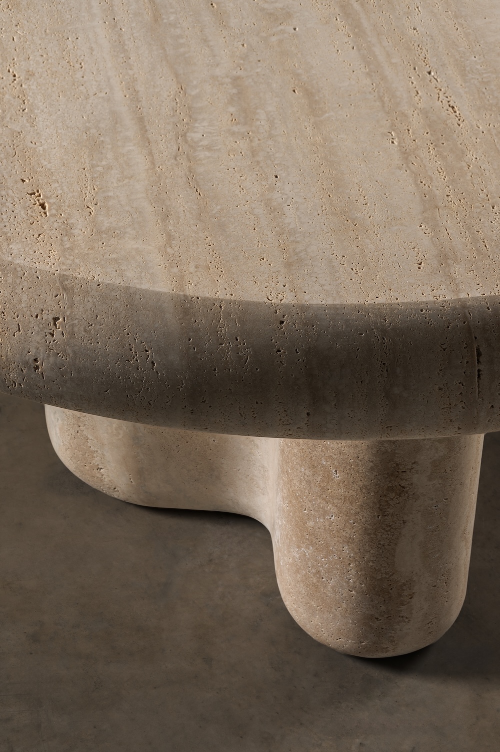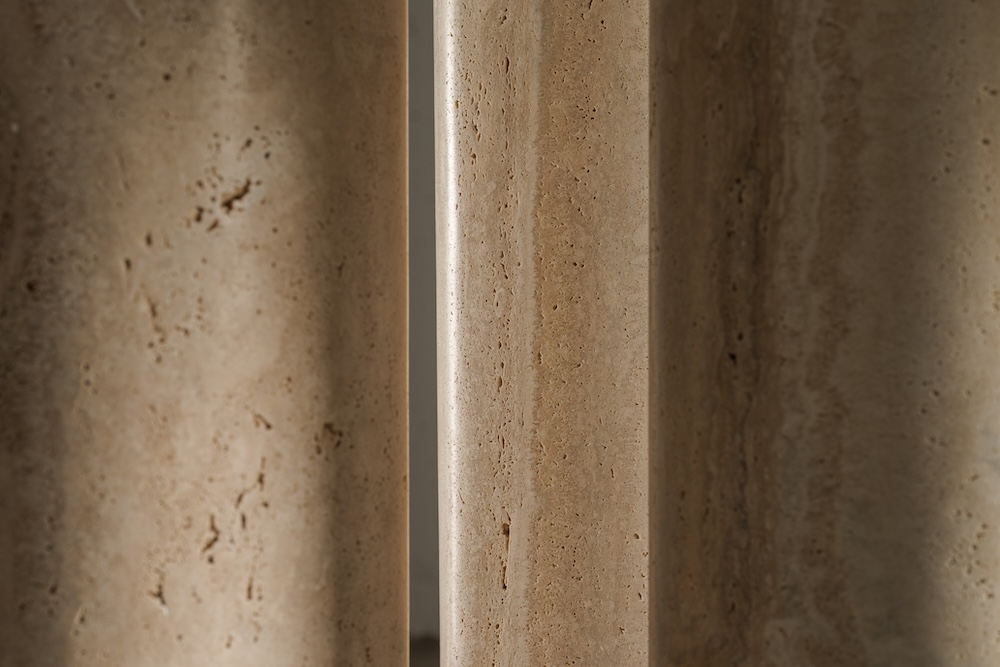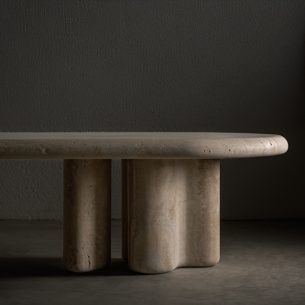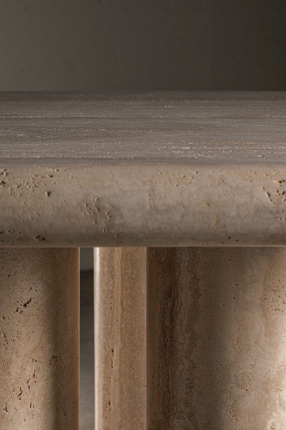 The Oval Dining Table, by Chiara Provasiis, crafted in solid travertine, pairing an elegant oval top with a sculptural columnar base. Its pure geometric form highlights the natural beauty of the stone while creating a timeless centerpiece for a dining space.