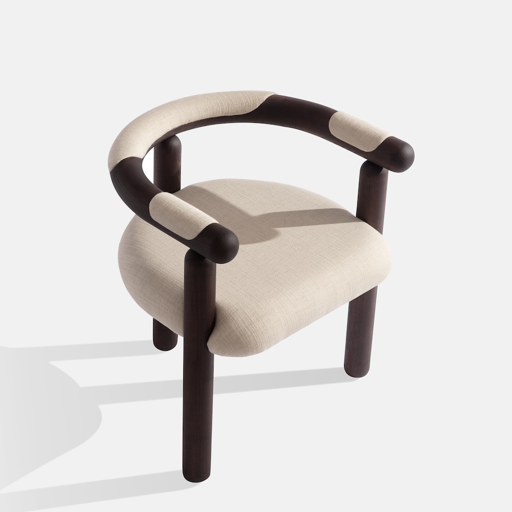 The Panda Dining Chair by Matteo Zorzenoni for Carpanese Home is a comfortable and enveloping seat that takes its name from the inlaid “spots” of fabric along its wooden frame. Crafted entirely from solid turned ash wood and finished by hand, the chair features padding seamlessly integrated into the contours of the structure. The armrests are padded with rubber, paired with an upholstered seat supported by elastic straps. With its interplay of different materials, textures, and contrasts of color, Panda presents a unique and sculptural character while retaining a pure, essential form.
