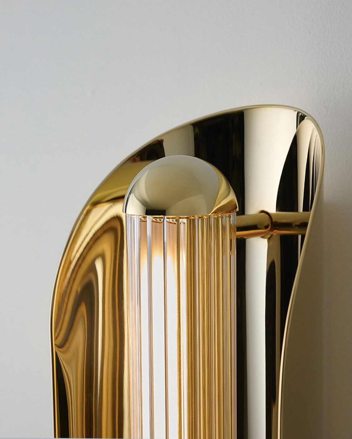 The Silex Cannelé Wall Sconce combines pale gold metalwork with vertically fluted glass, producing a refined play of texture and luminosity. Its linear profile and sculptural detailing bring both elegance and presence to a space.