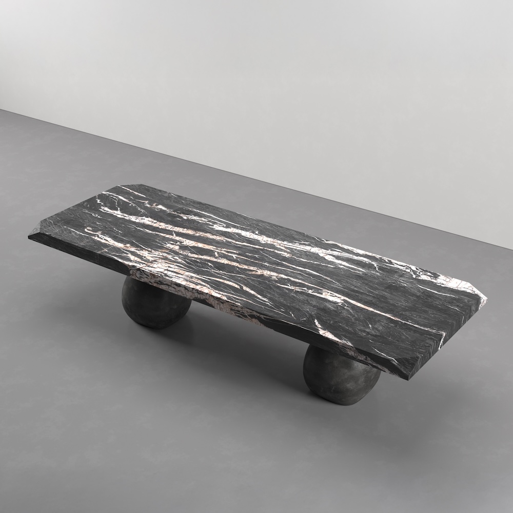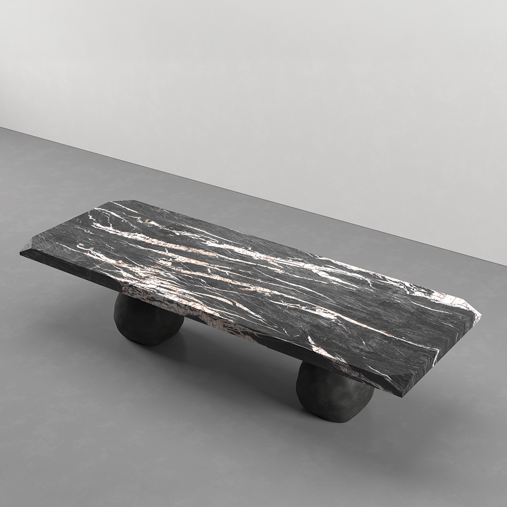 The Torra Dining Table by Jordan Carlyle features a sculptural design that pairs a solid dark stone top with two hand-cast bronze bases. Each base is organic in form, creating a sense of movement and balance while supporting the monolithic tabletop. The combination of stone and bronze evokes timeless craftsmanship and material contrast, making the piece both functional and artistic