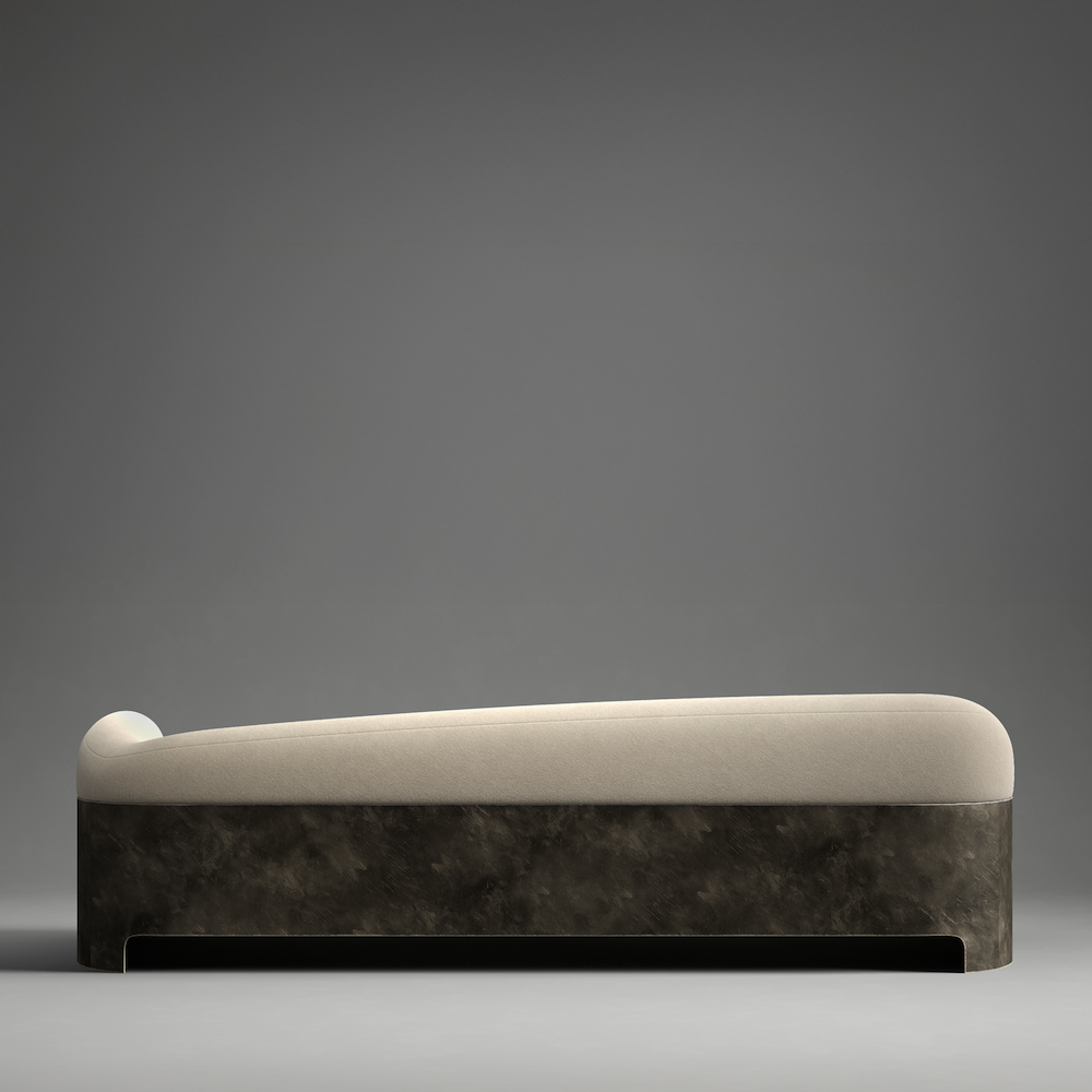 The Arden Sofa by Jordan Carlyle features a continuous sculptural silhouette upholstered in plush mohair and resting on a recessed cast brass base in a bronzed finish. Defined by its fluid curvature and seamless transitions, the piece embodies balance and quiet strength. The enveloping back and arms merge into a single soft line, showcasing a study in proportion, craftsmanship, and material harmony.