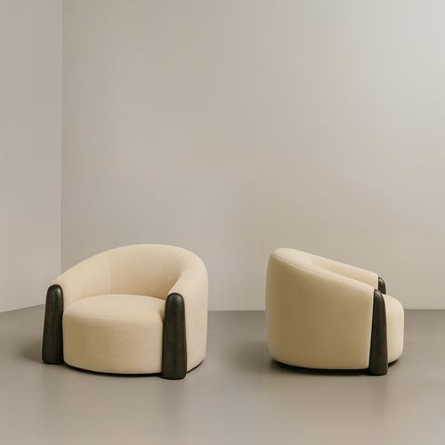 The Athena Armchair, designed by Jordan Carlyle, embodies a sculptural elegance with its rounded silhouette and commanding bronze arms. Upholstered in mohair, the chair balances softness with strength, while the patinated bronze arms create a striking architectural presence.