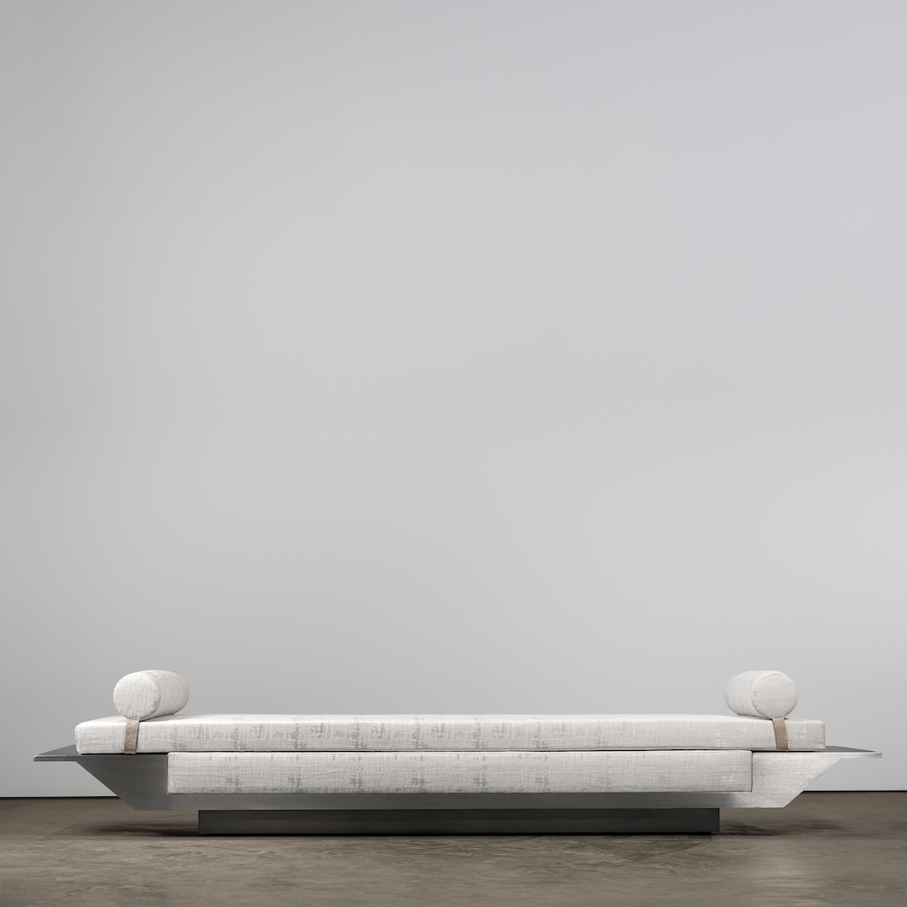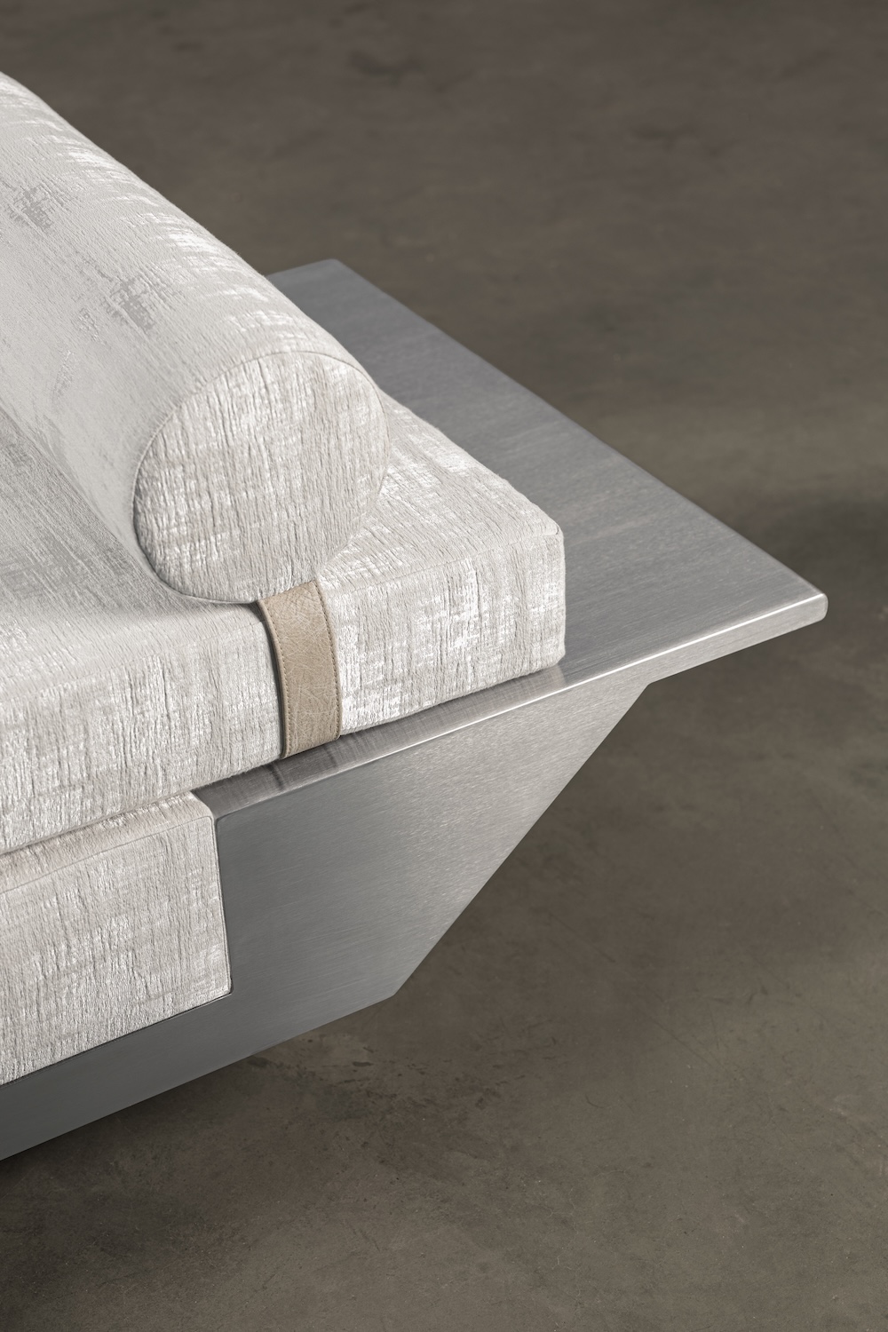 The Borris daybed features a sculptural metal base paired with an upholstered cushion, creating a low architectural form that balances comfort with strong geometric presence. The extended metal platforms on each side emphasize the horizontal silhouette while cylindrical bolster cushions add a refined detail to the composition. Designed as both a seating and lounging piece, the daybed combines upholstery and metal finishes to create a striking contemporary statement.