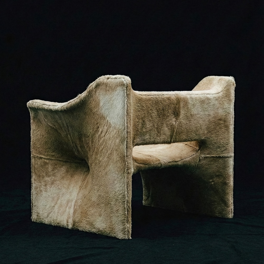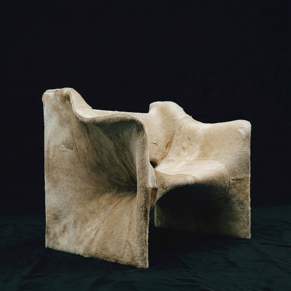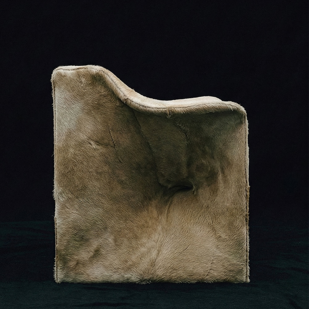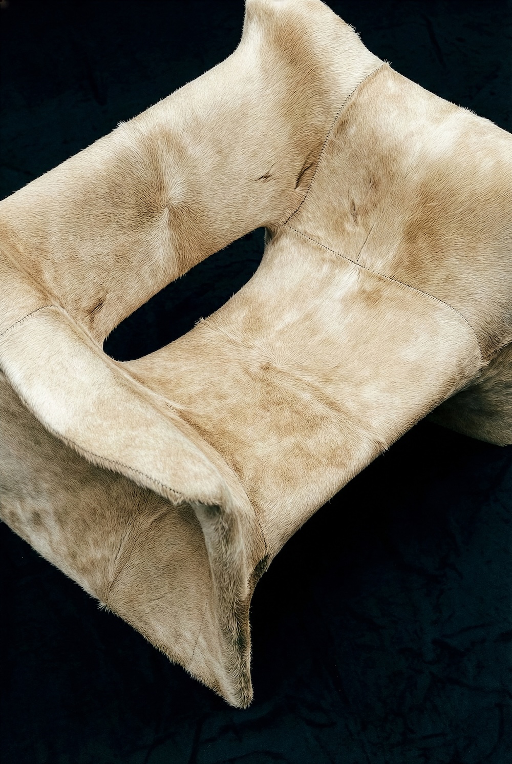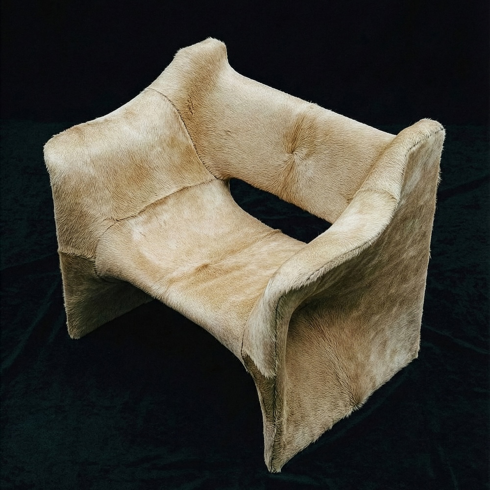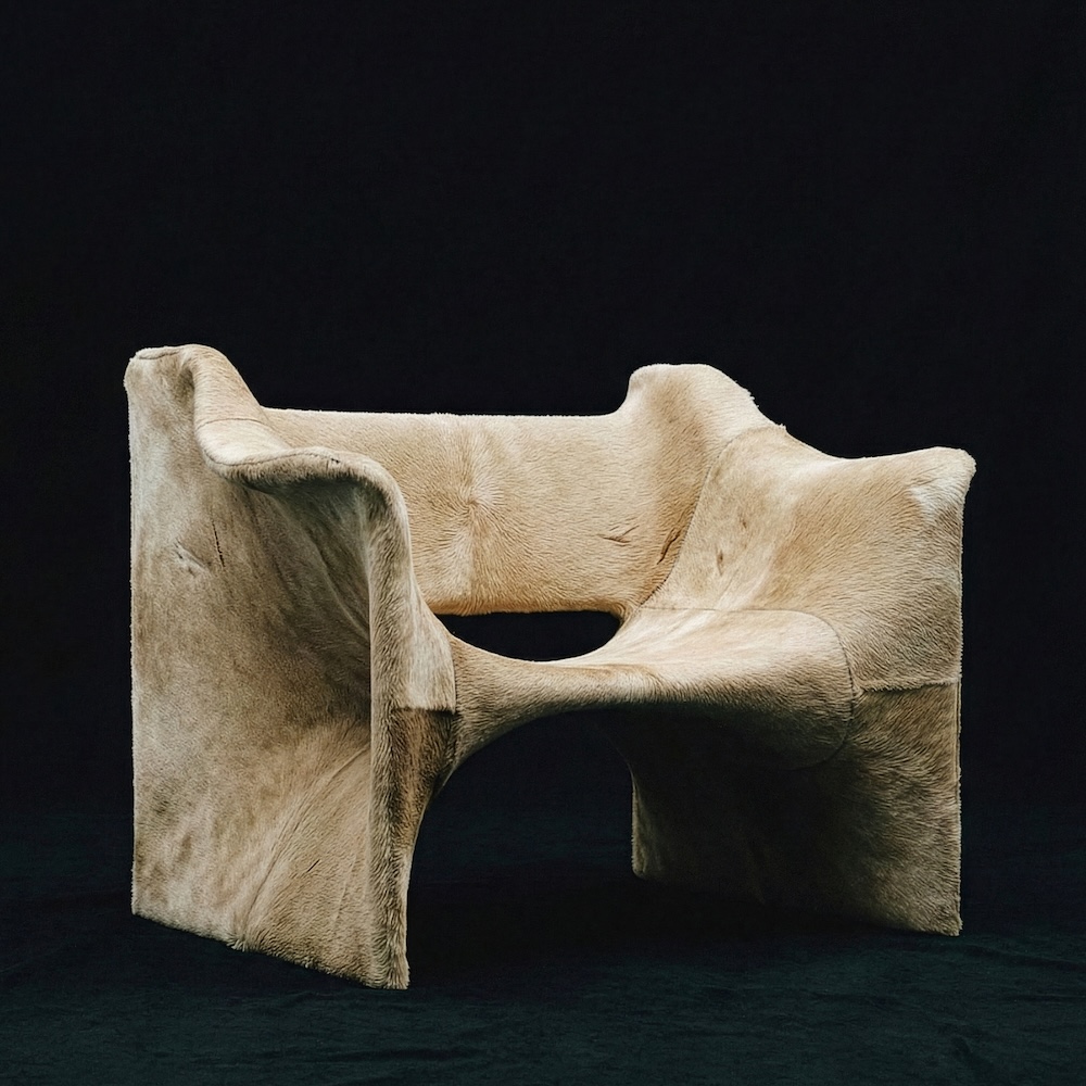 The Deus armchair by David and Carlos Romell presents a bold, sculptural silhouette defined by fluid lines and a seamless interplay between structure and material. Upholstered in natural cream cowhide over a solid wood structure, the form feels both grounded and expressive, with a carved presence that elevates it beyond a traditional seating piece.