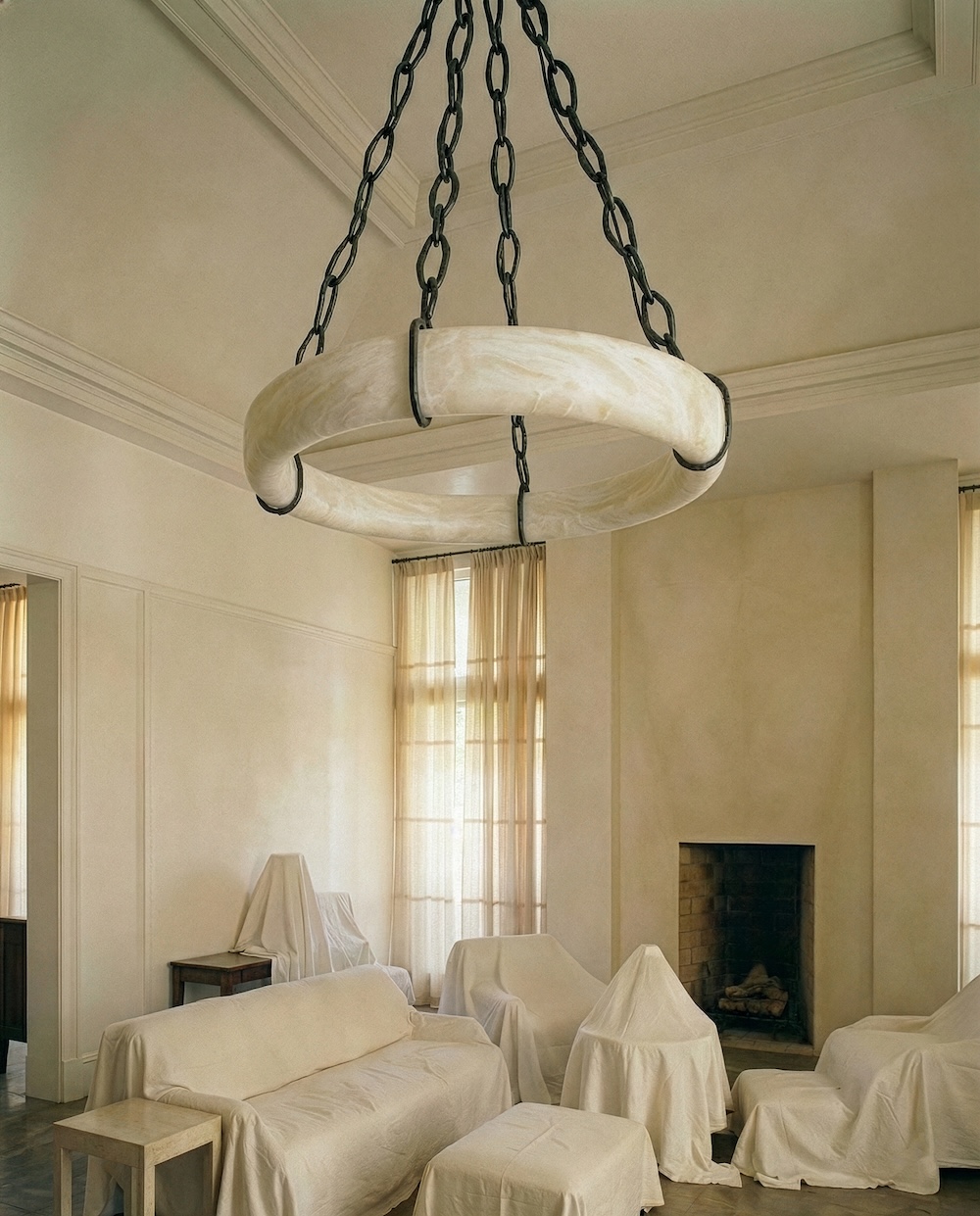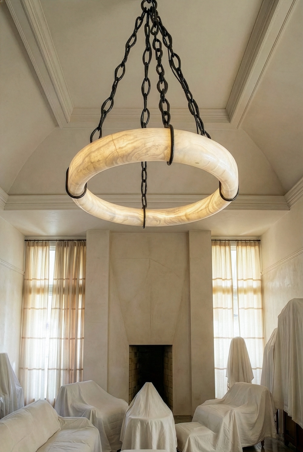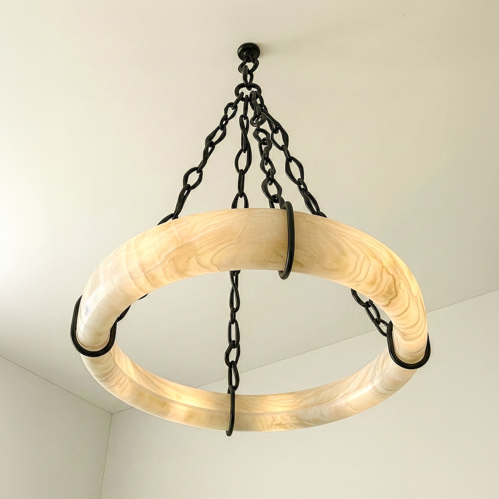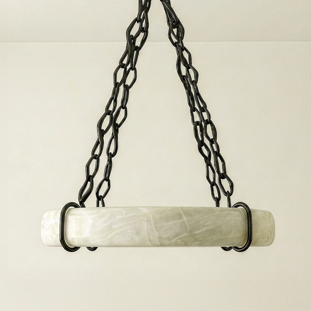 The Deus chandelier by David and Carlos Romell explores weight and suspension through a bold, elemental composition. A circular alabaster form appears to float within a network of dark patinated bronze chains, creating a striking contrast between solidity and lightness. The honed stone softly diffuses illumination, while the metal structure introduces a raw, architectural presence.