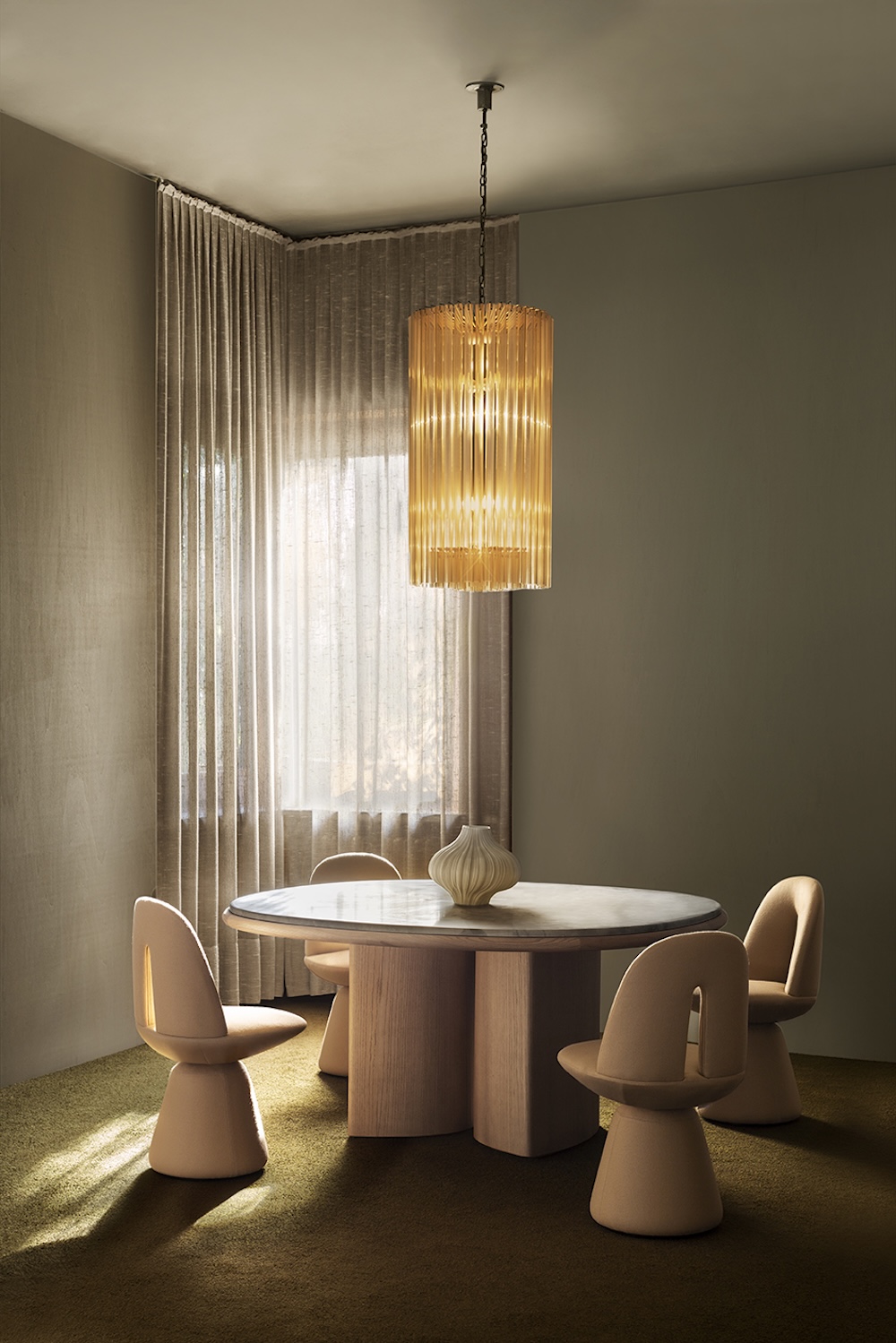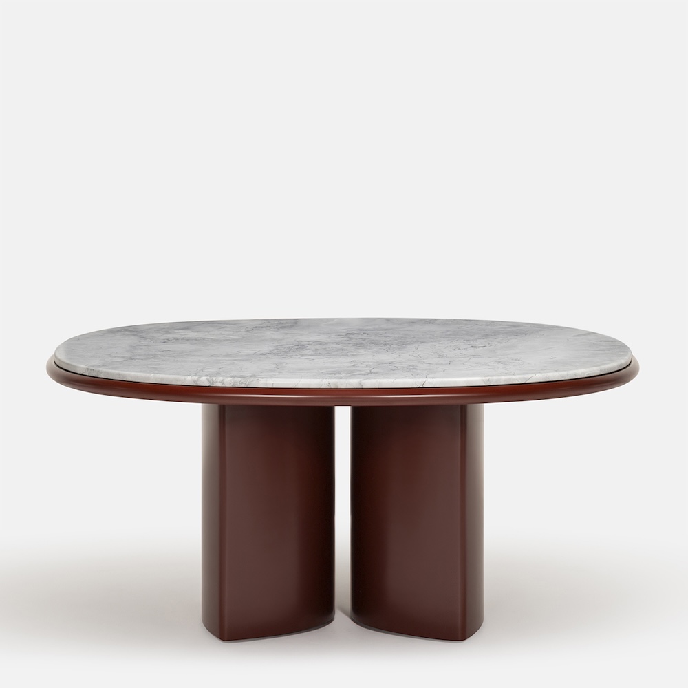 The Double R Dining Table by Simone Bonanni for Carpanese Home is defined by two sculptural bases placed side by side, creating the effect of a single piece that supports the round tabletop. Balancing geometric precision with softness, the table explores the perception of volumes and their dialogue within space. The round top is available in a range of finishes including ash, lacquer, marble, and porphyry stone, paired with legs in ash or lacquered wood. The result is a table that unites bold presence with refined gentleness.
