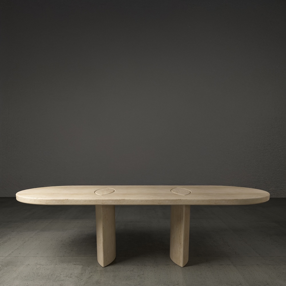 The Eclipse collection, designed by Giorgio Bonaguro, explores the balance between sculptural form and functional design. This dining table features two bold central marble legs that support an elongated oval top, emphasizing both stability and elegance. The softened edges and clean geometry highlight the natural beauty of the stone, while the central base design allows for generous seating and a refined architectural presence.