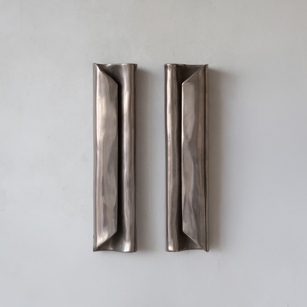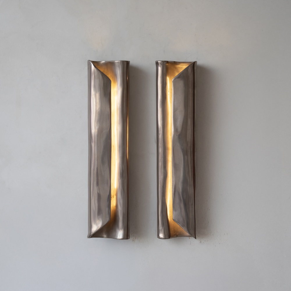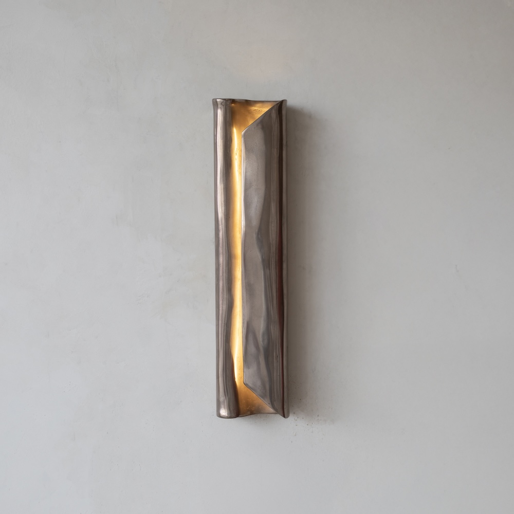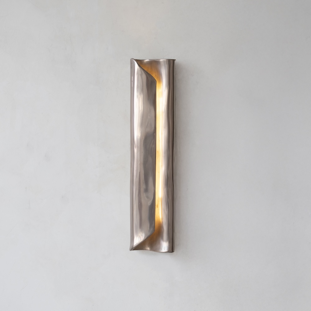 The Embrace Wall Sconce collection is sculpted in concrete and plaster with integrated LED lighting, creating a warm, atmospheric glow that highlights its hand formed surface. Each piece is wall mounted and designed for indoor use, offering a balance of texture, light, and sculptural presence.