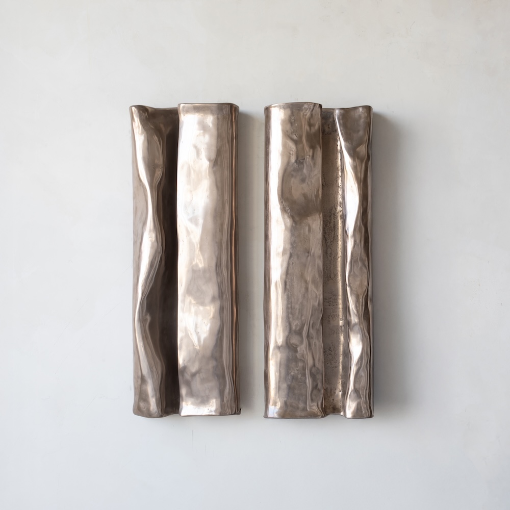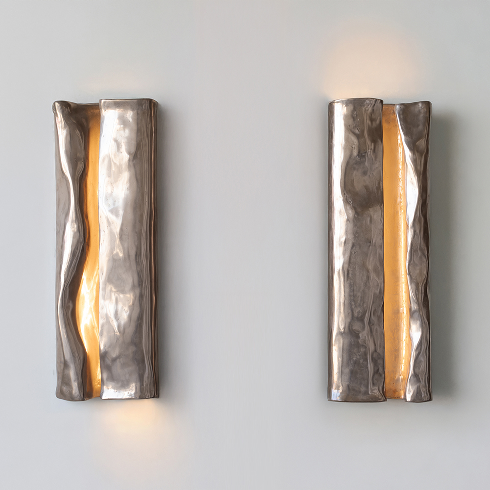 The Endless Summer Sconce collection is sculpted in concrete and plaster with a liquid bronze finish, creating a warm, dimensional surface that highlights its organic relief. Each piece features integrated LED lighting that softly washes the wall, emphasizing texture and depth. Designed for indoor wall mounting, the collection brings a strong architectural presence while maintaining a refined glow.