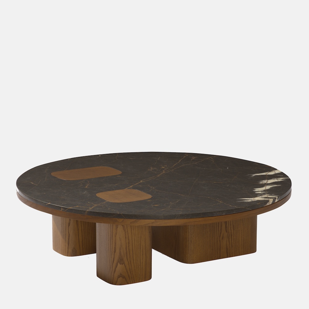 The Erice table collection blends refined geometry with a strong material presence. Available with either a marble or wooden top, each piece is anchored by sculptural bases and accented with inset details that highlight craftsmanship and contrast.