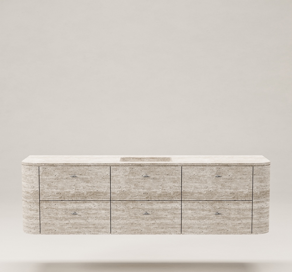 The J.5 bath vanity embodies clean architectural lines and masterful craftsmanship. Its softly curved form is fully clad in stone, creating a monolithic presence that feels both sculptural and functional. Designed with precision, the piece features deep drawers with dovetail joints and discreet integrated pulls, offering seamless storage in a refined presentation.