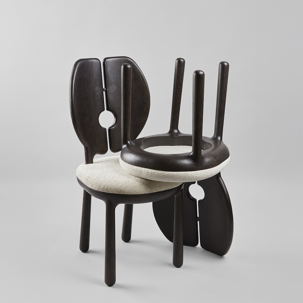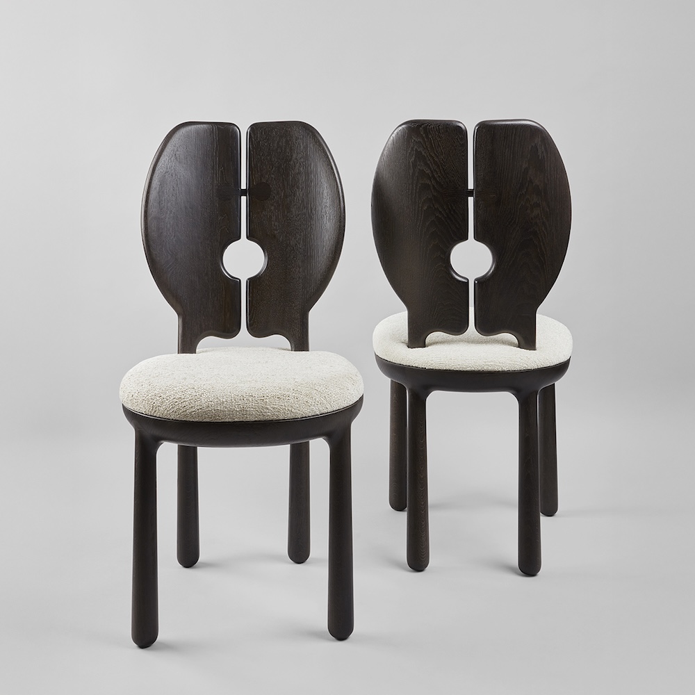 The Jules & Jim Dining Chair brings together sculpted solid black oak with a soft upholstered seat, creating a piece that feels both refined and warm. The split back silhouette with its circular cutout gives the chair a strong graphic presence while still remaining versatile enough for different interiors. The seat is offered in a selection of Holden fabrics that complement the depth of the black oak.