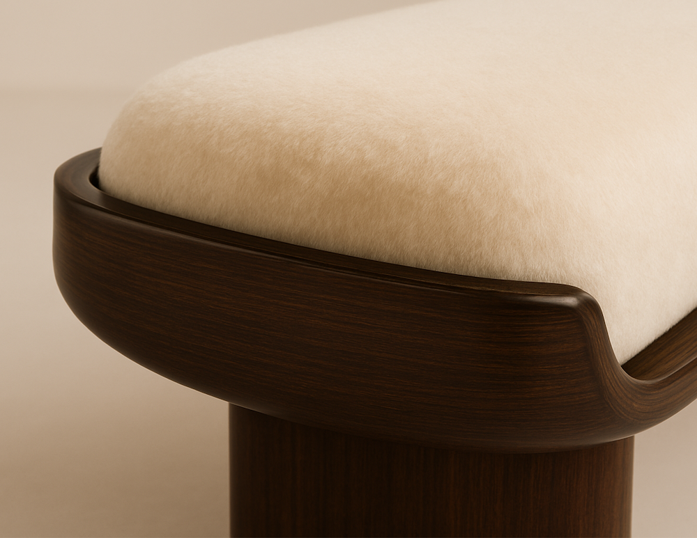 The Marais Bench by Jordan Carlyle features a refined silhouette with a plush mohair seat resting on a sculpted lacquered base. Its minimalist proportions are elevated by the interplay of texture and finish, creating a versatile piece that complements both modern and classic interiors. The recessed base and softly rounded seat edges emphasize craftsmanship and balance