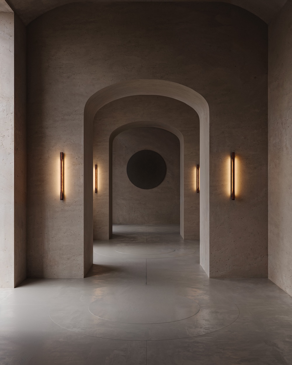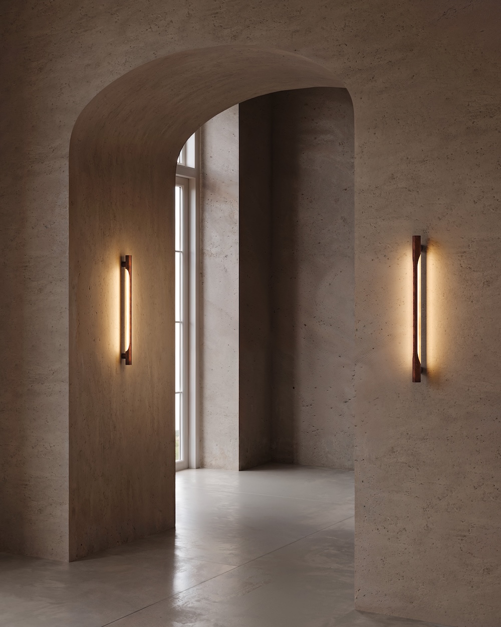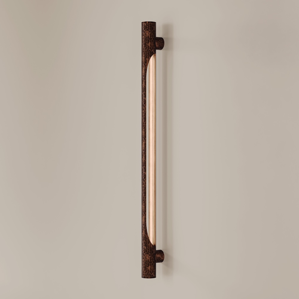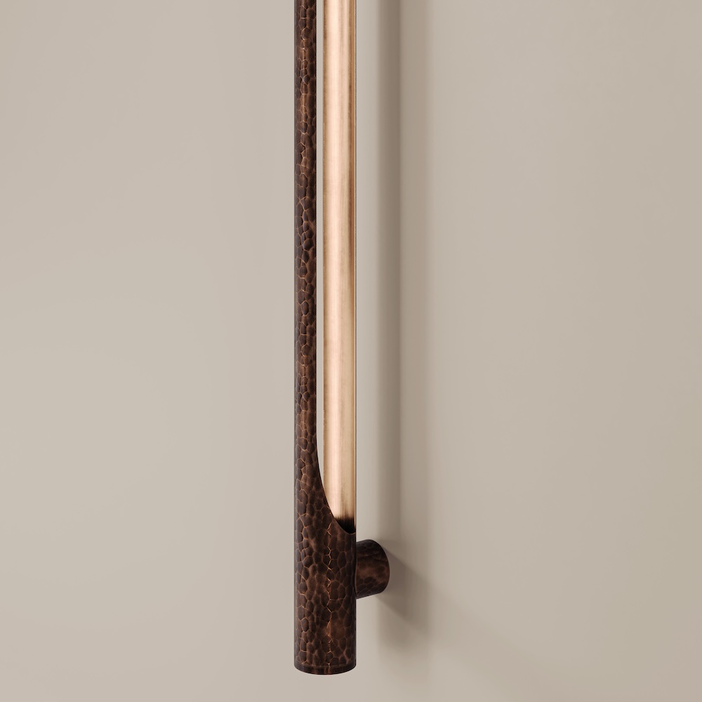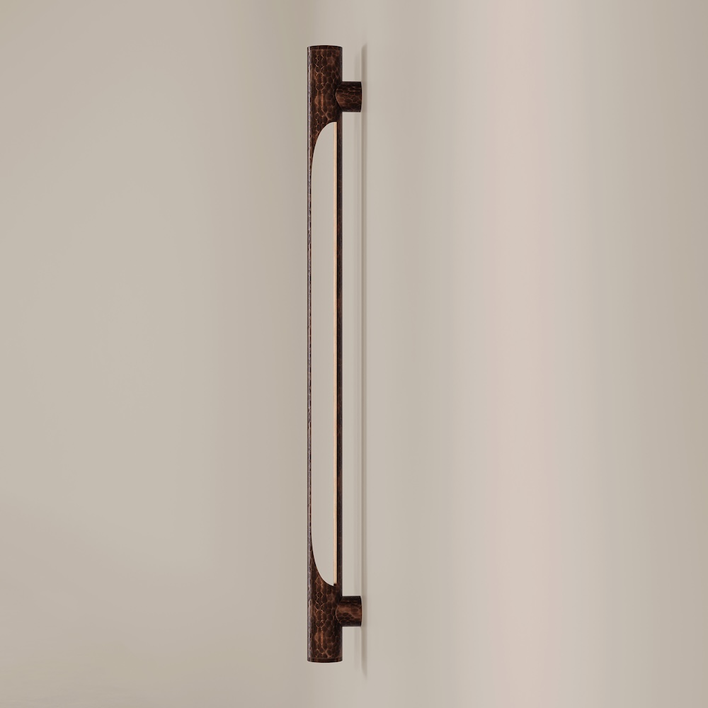 The Masque wall sconce is defined by a refined linear profile and a sculptural metal surface that plays with light and texture. Crafted from solid metal tubing, each piece is hand-sculpted and patinated, creating a subtle dimensionality across the surface. The integrated LED source is discreetly housed within, producing a warm and even glow that enhances the material depth while maintaining a clean architectural presence.