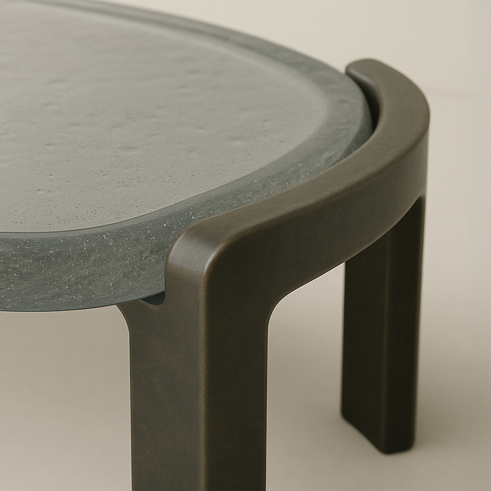 The Moro coffee table by Jordan Carlyle combines a sculptural bronze base with a substantial cast glass top, balancing softness and structure in a low, grounded form. The curved geometry and thick glass surface give the piece a quiet presence while the solid base anchors it with weight and permanence.