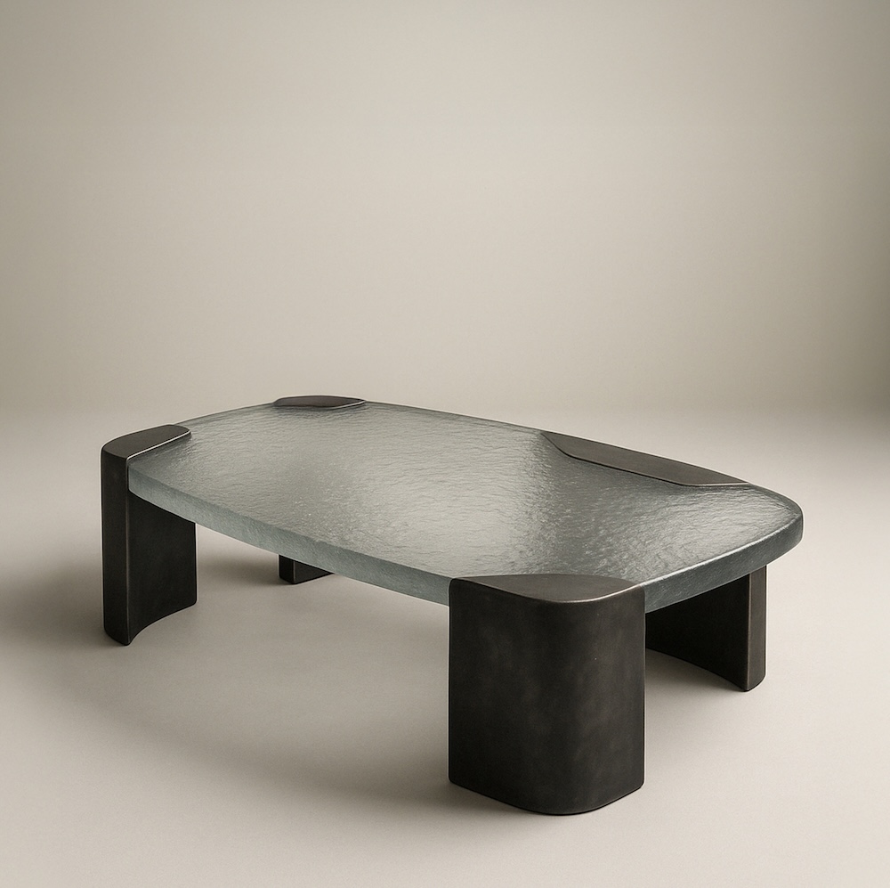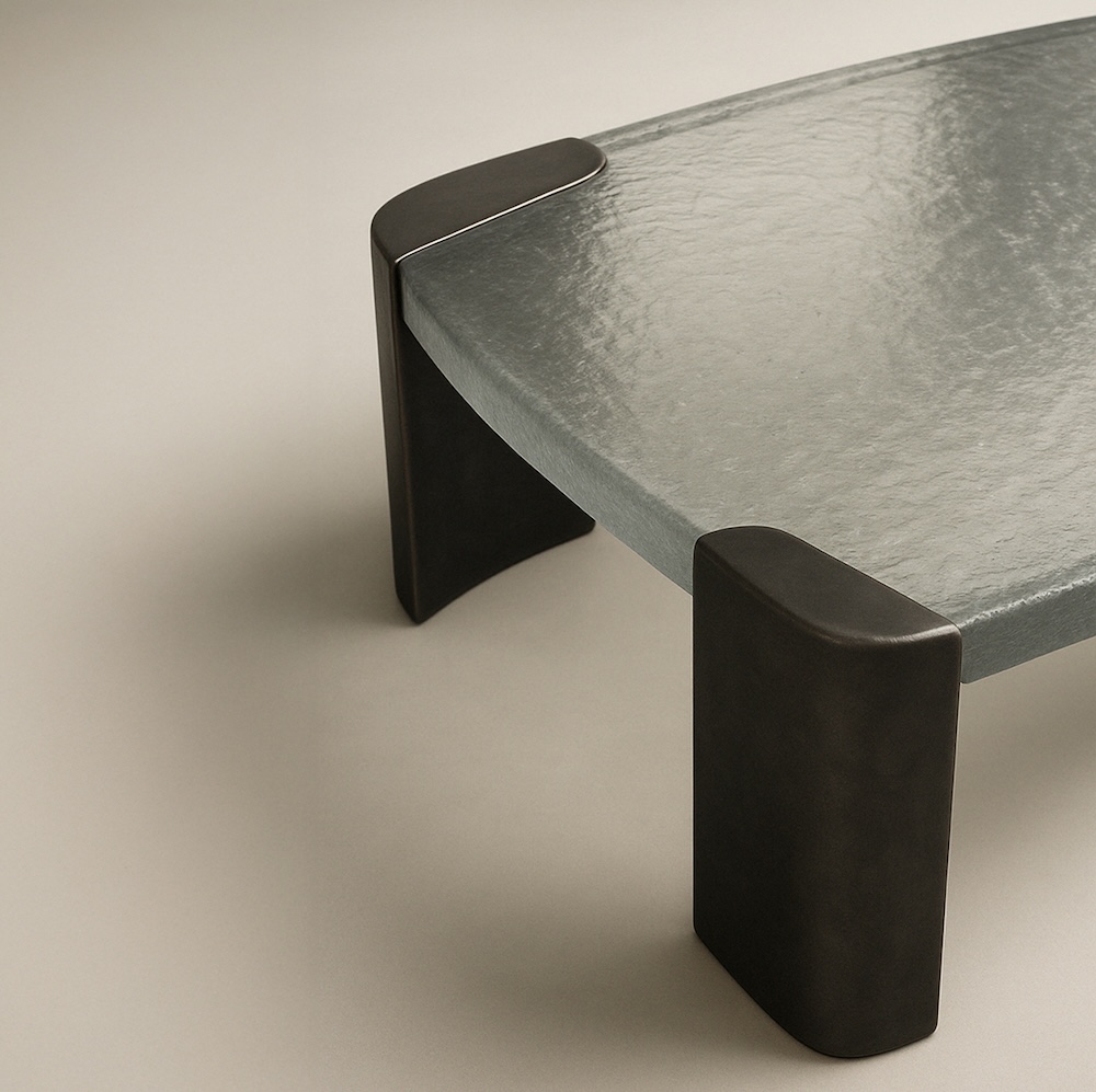 The Nocturne Coffee Table by Jordan Carlyle features a cast glass top resting on a silvered bronze base. The sculptural form and interplay of materials create a sense of quiet strength, balancing visual weight with refined proportion. Each table is handcrafted with meticulous attention to detail, resulting in subtle variations that make every piece unique.
