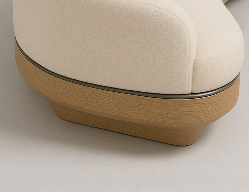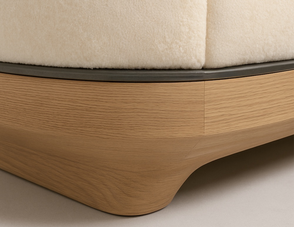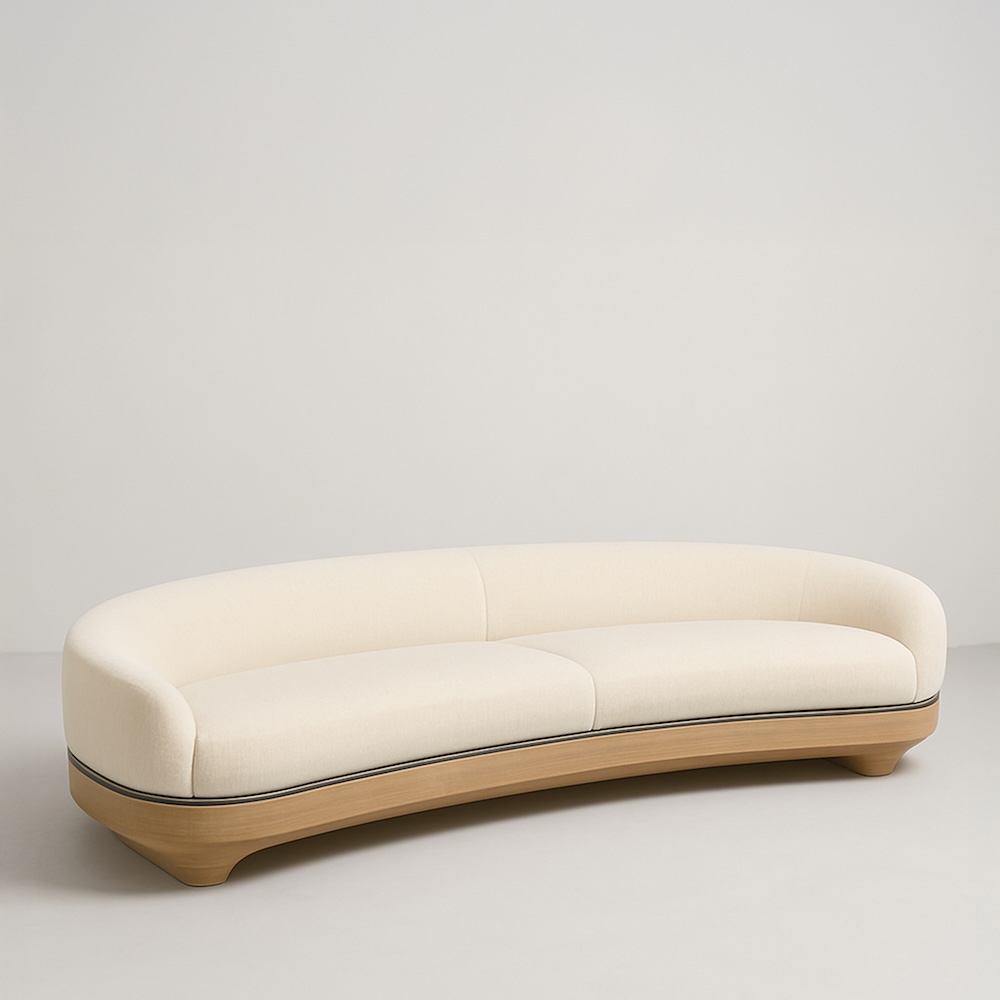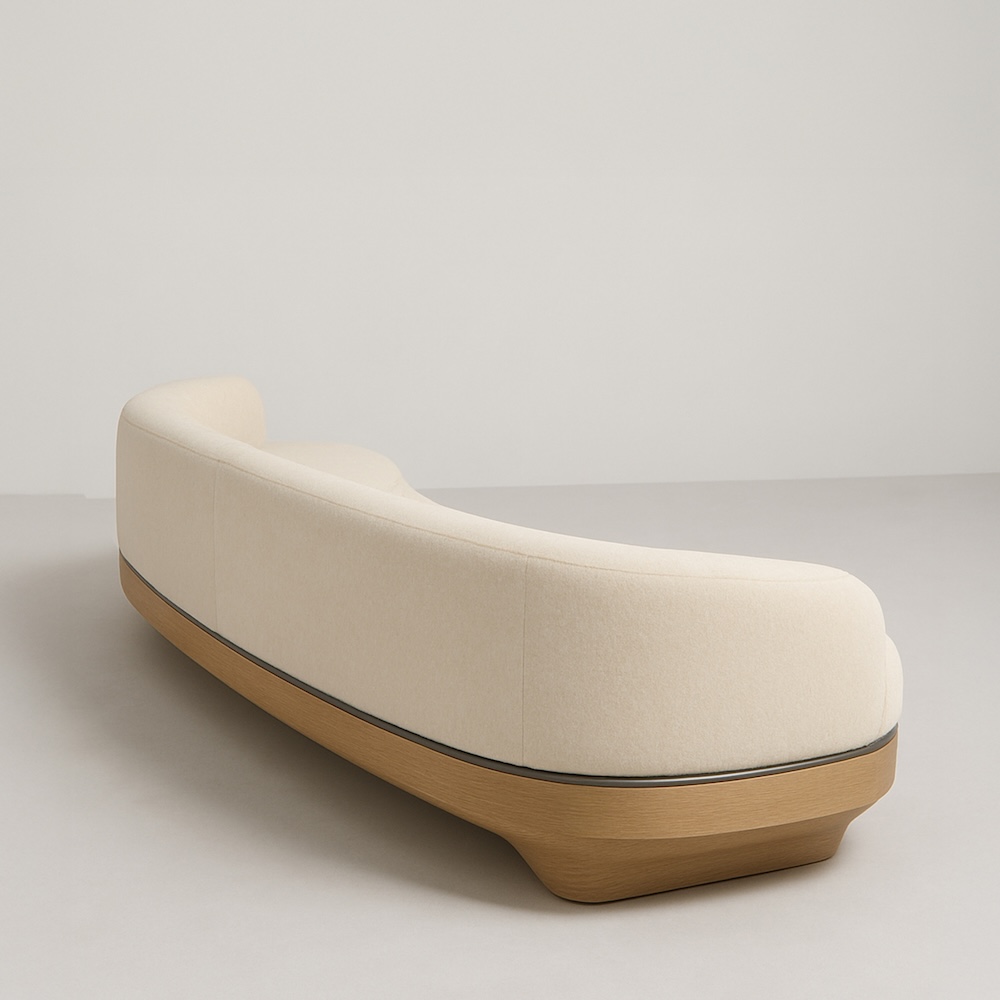 The Nola Sofa by Jordan Carlyle features an elegant curved silhouette upholstered in rich mohair with an oak wood base accentuated by a bronze detail. Its continuous back and arm design creates a soft, sculptural presence, while the recessed base adds visual lightness. The piece embodies a balance of craftsmanship, proportion, and warmth through the interplay of natural materials