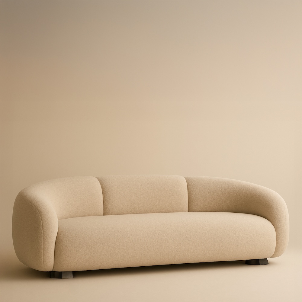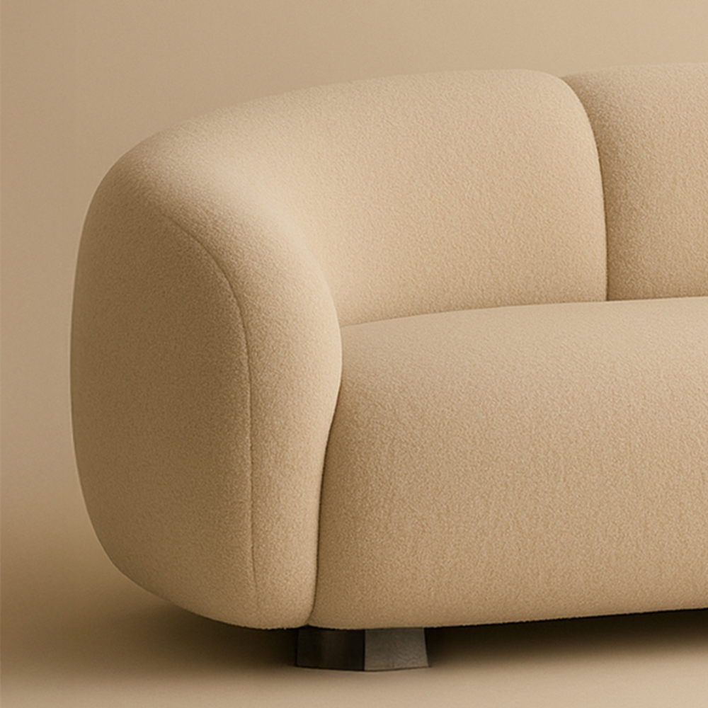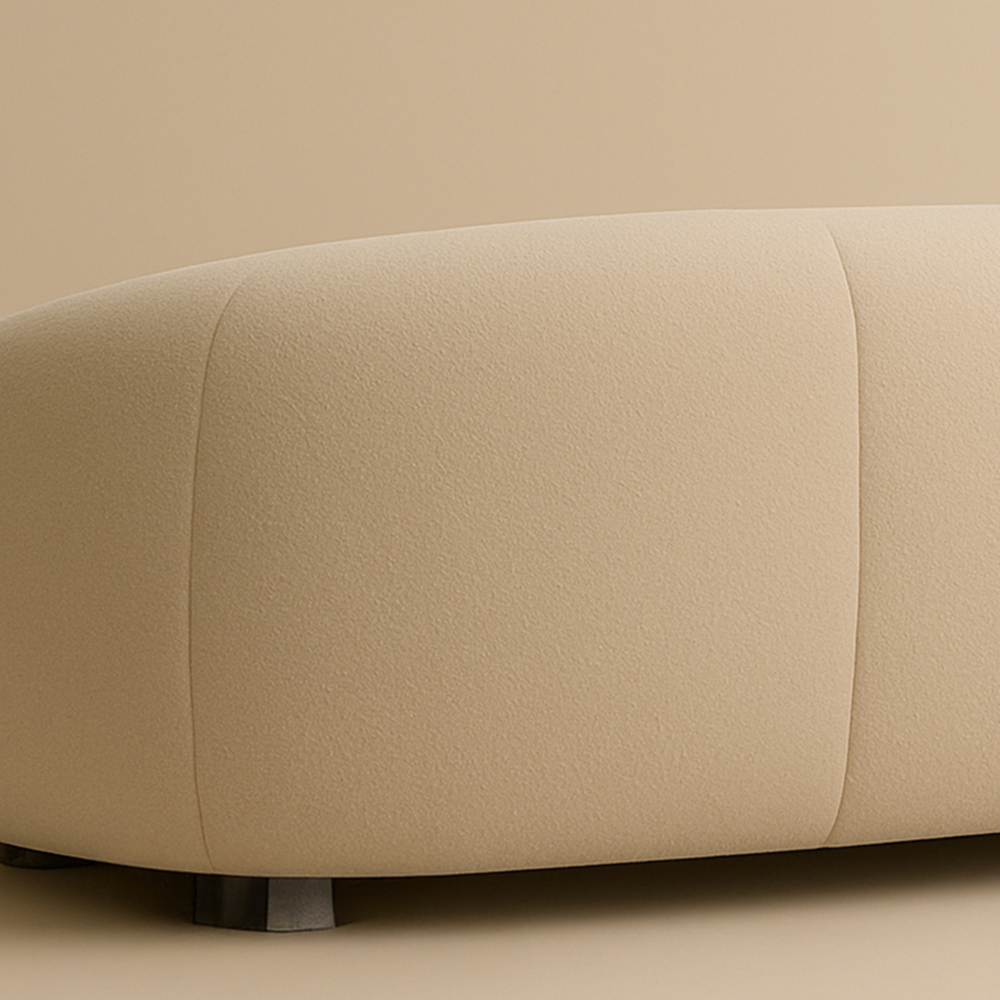 The Nuve Sofa by Jordan Carlyle features a soft, enveloping silhouette fully upholstered in mohair and supported by discreet bronze metal feet. Its continuous lines and rounded contours create a sense of fluidity and comfort, while the low profile and balanced proportions lend it a sculptural presence suitable for both residential and hospitality interiors