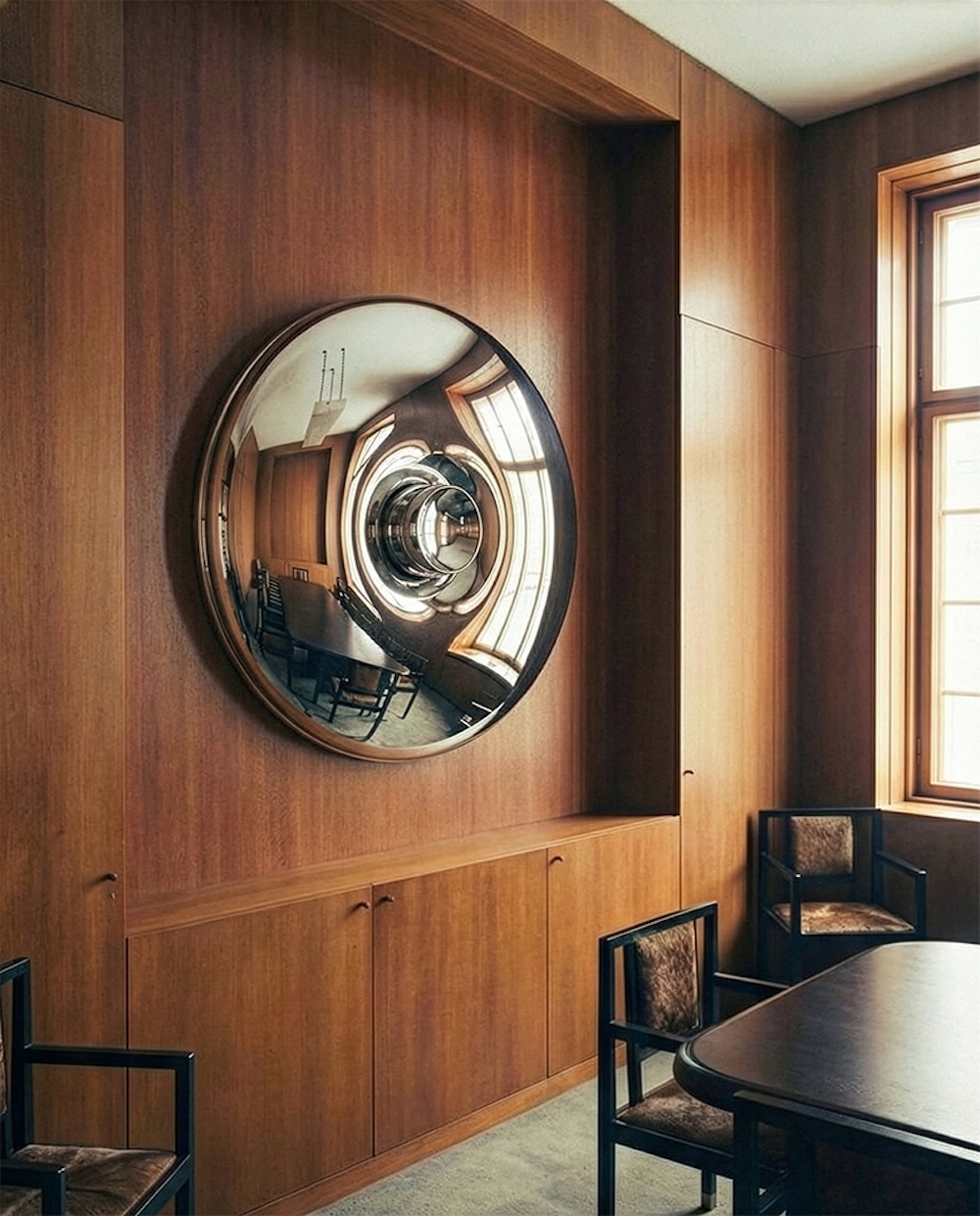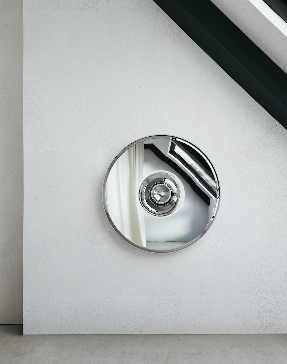 The Ofrenda Steel Mirror by David and Carlos Romell transforms reflection into sculpture. Crafted from polished stainless steel, its concave form captures and distorts light, creating a dynamic play between viewer and space. The surface becomes both a mirror and an artwork, merging precision engineering with an elemental simplicity that feels timeless and architectural.