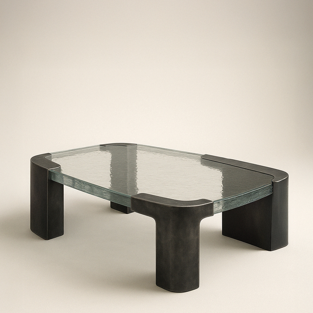 The Oura Coffee Table By Jordan Carlyle pairs a sculptural silvered bronze base with a substantial cast glass top. The clean, softened geometry and balanced proportions give the piece a strong architectural presence while keeping the focus on material and form.