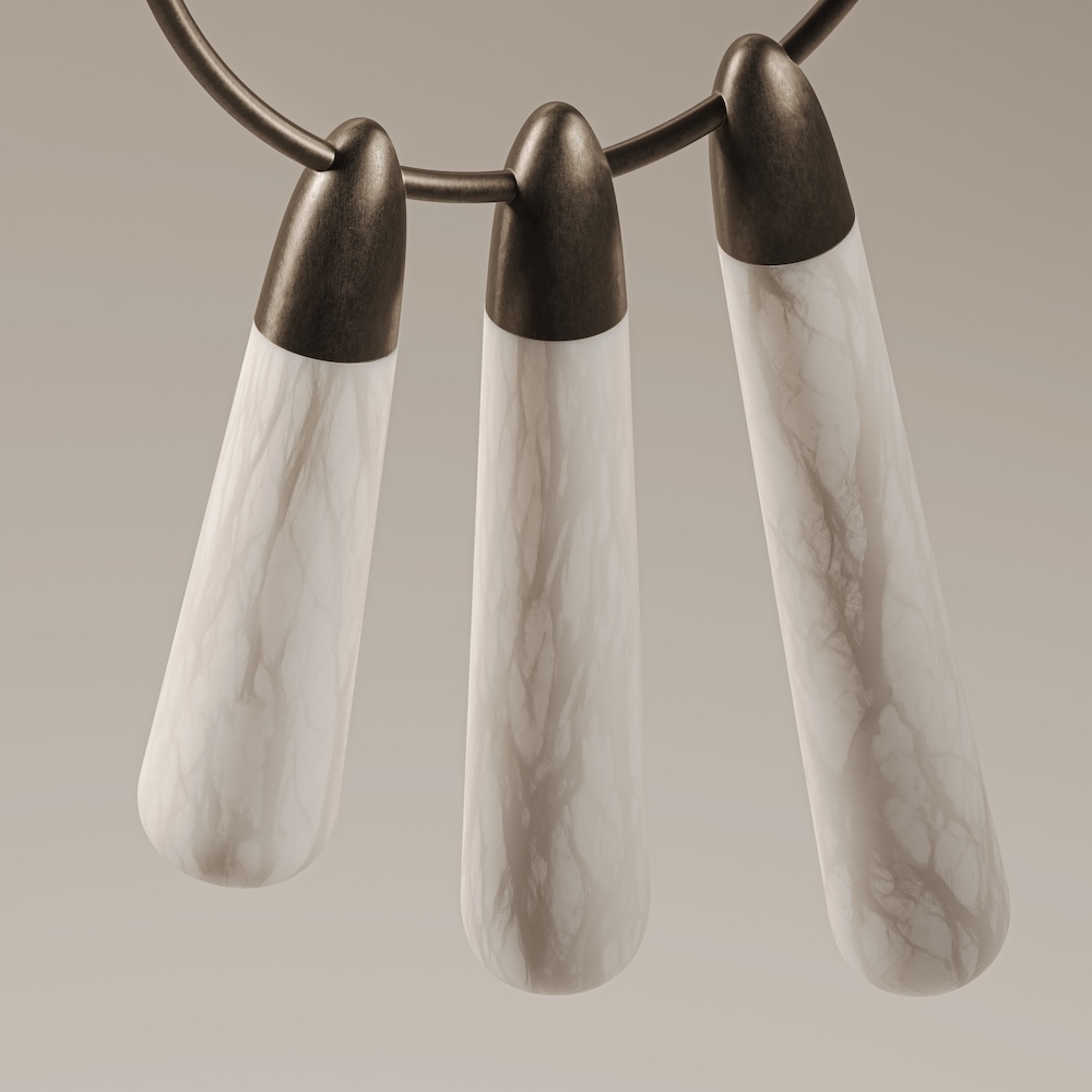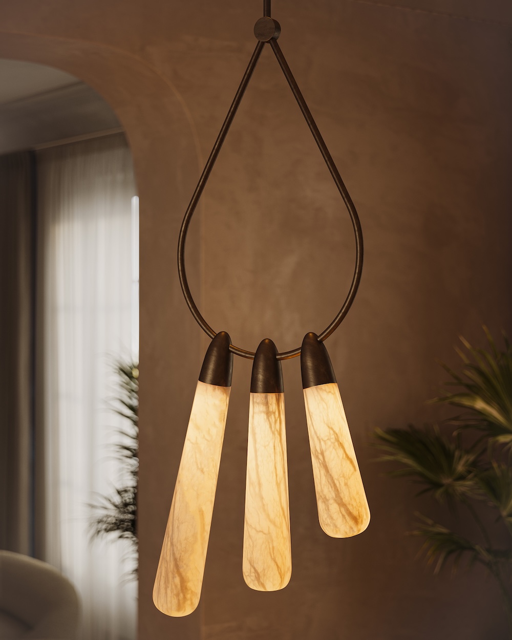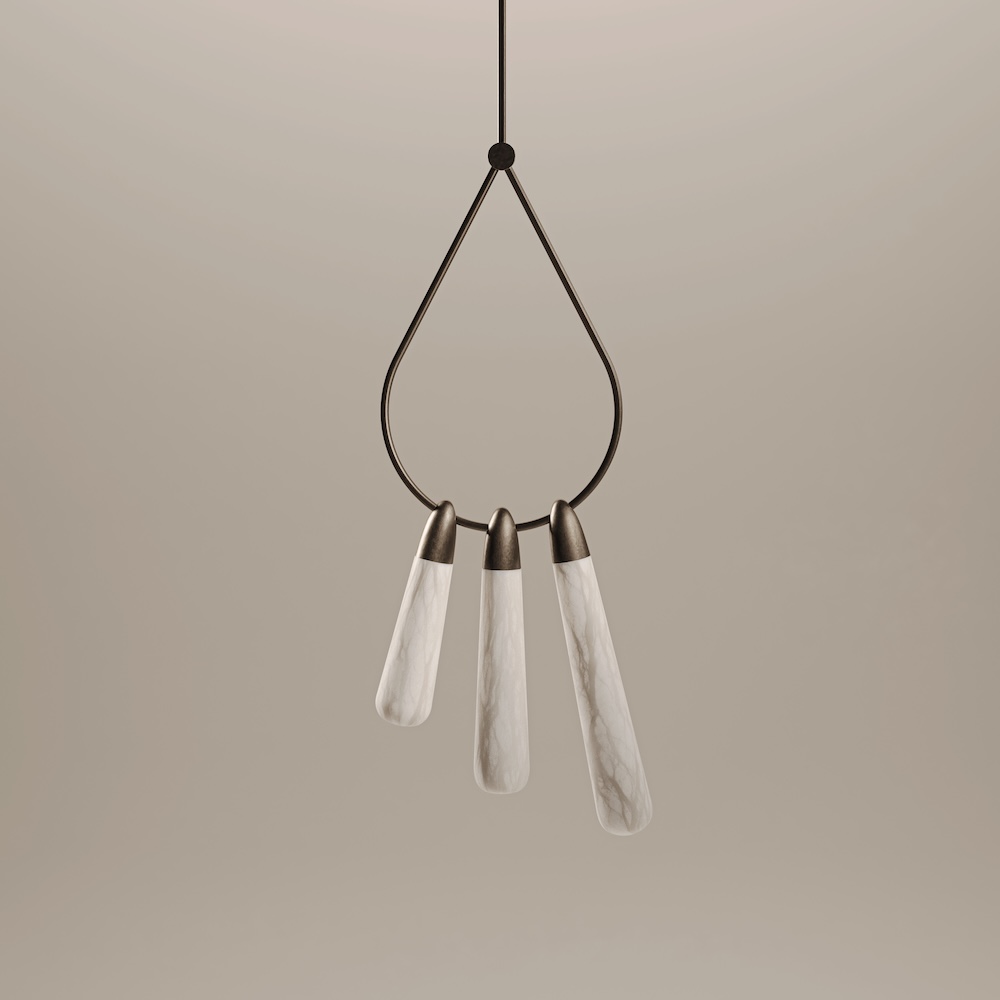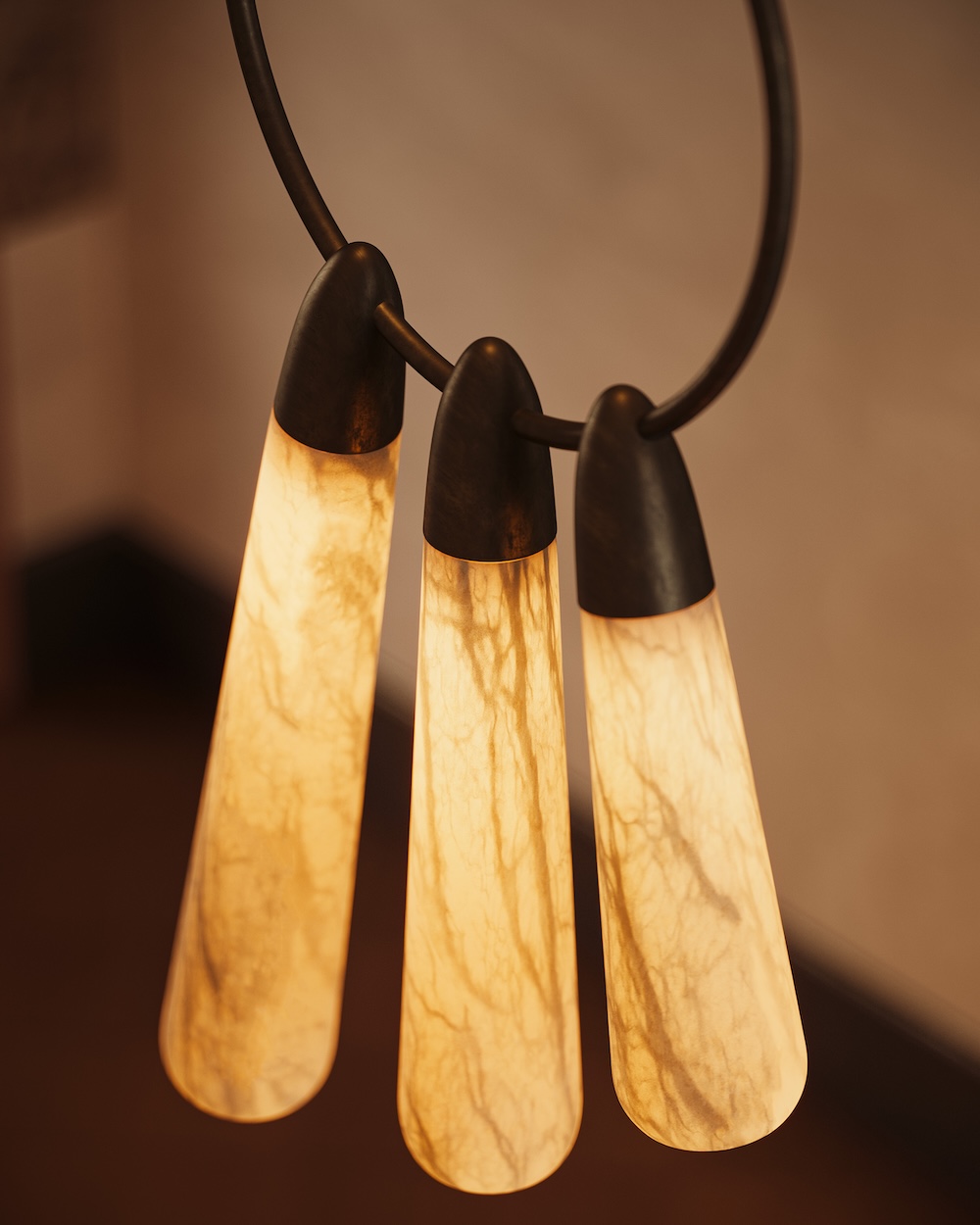 The Parure pendant is a sculptural composition that balances structure and softness through a looping brass form and suspended elongated diffusers. The interplay between the hand-patinated metal frame and the smooth alabaster elements creates a refined contrast, while the overall silhouette brings a sense of movement and elegance to the space.