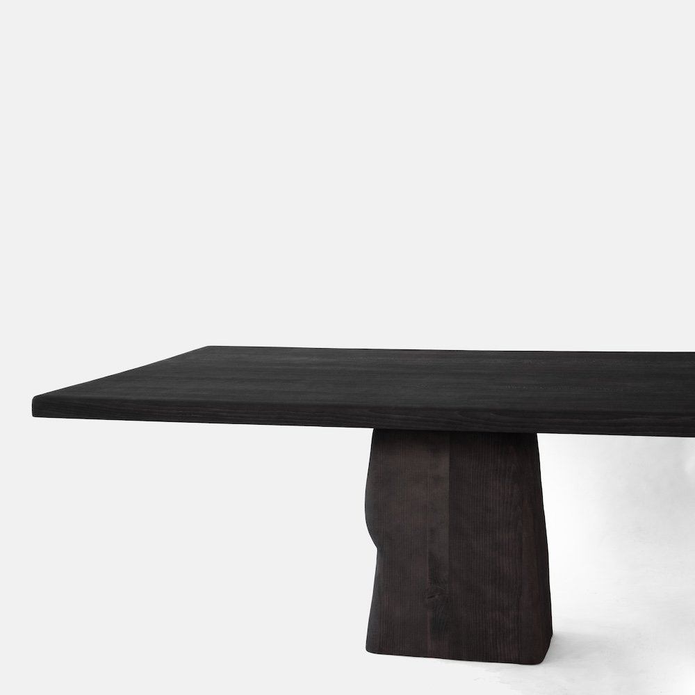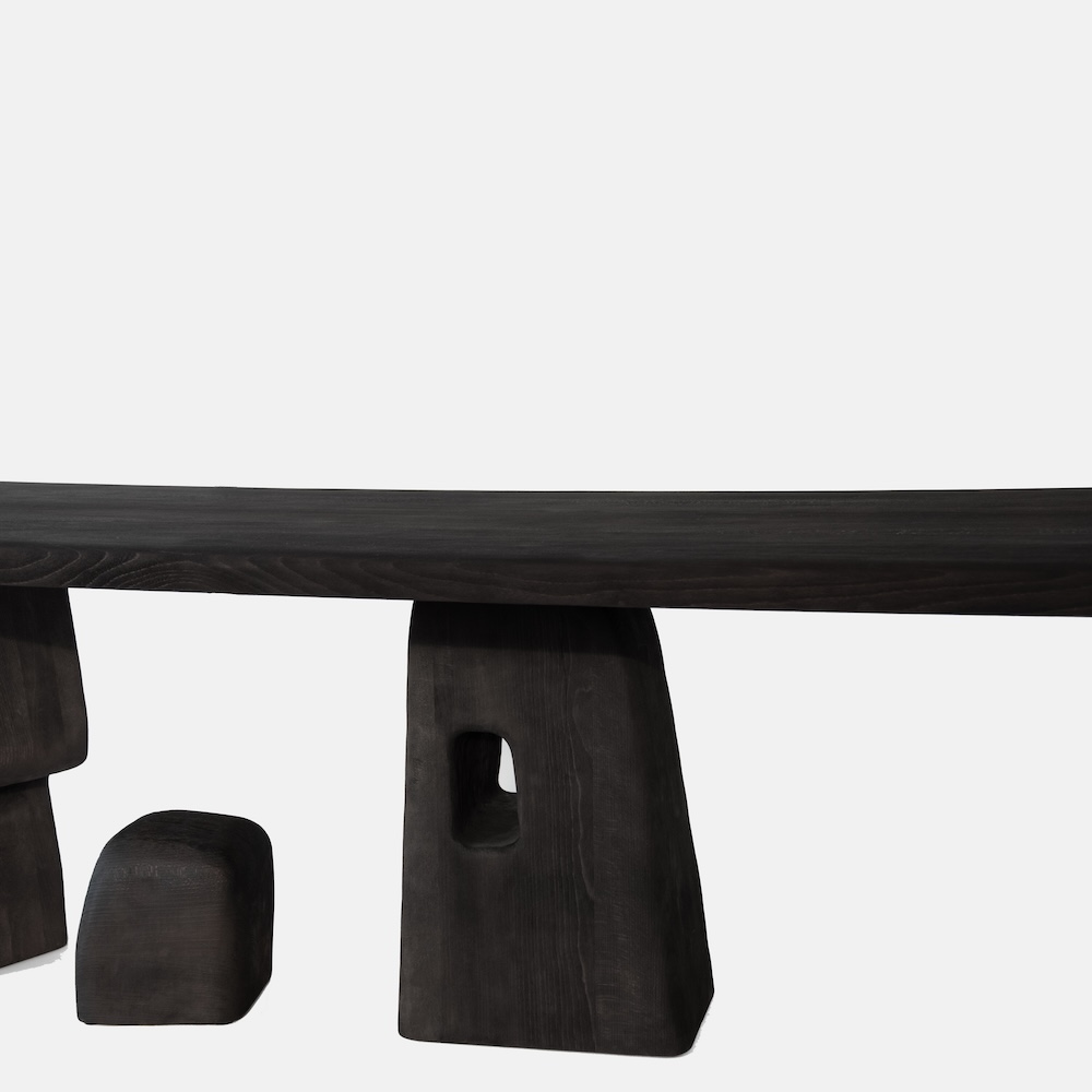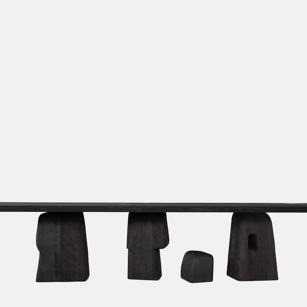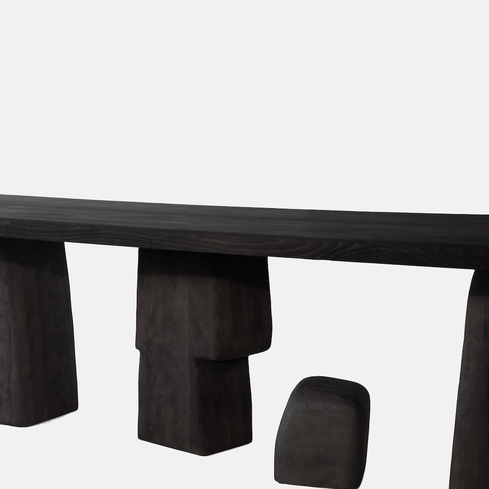 The Paul dining table is defined by its monolithic presence and sculptural base composition, crafted entirely in brushed beech wood. The design balances a refined, elongated top with three solid, hand shaped pedestal supports, creating a grounded yet architectural silhouette. Each base element carries a unique carved form, giving the piece a strong artisanal character while maintaining a clean and minimal overall expression.