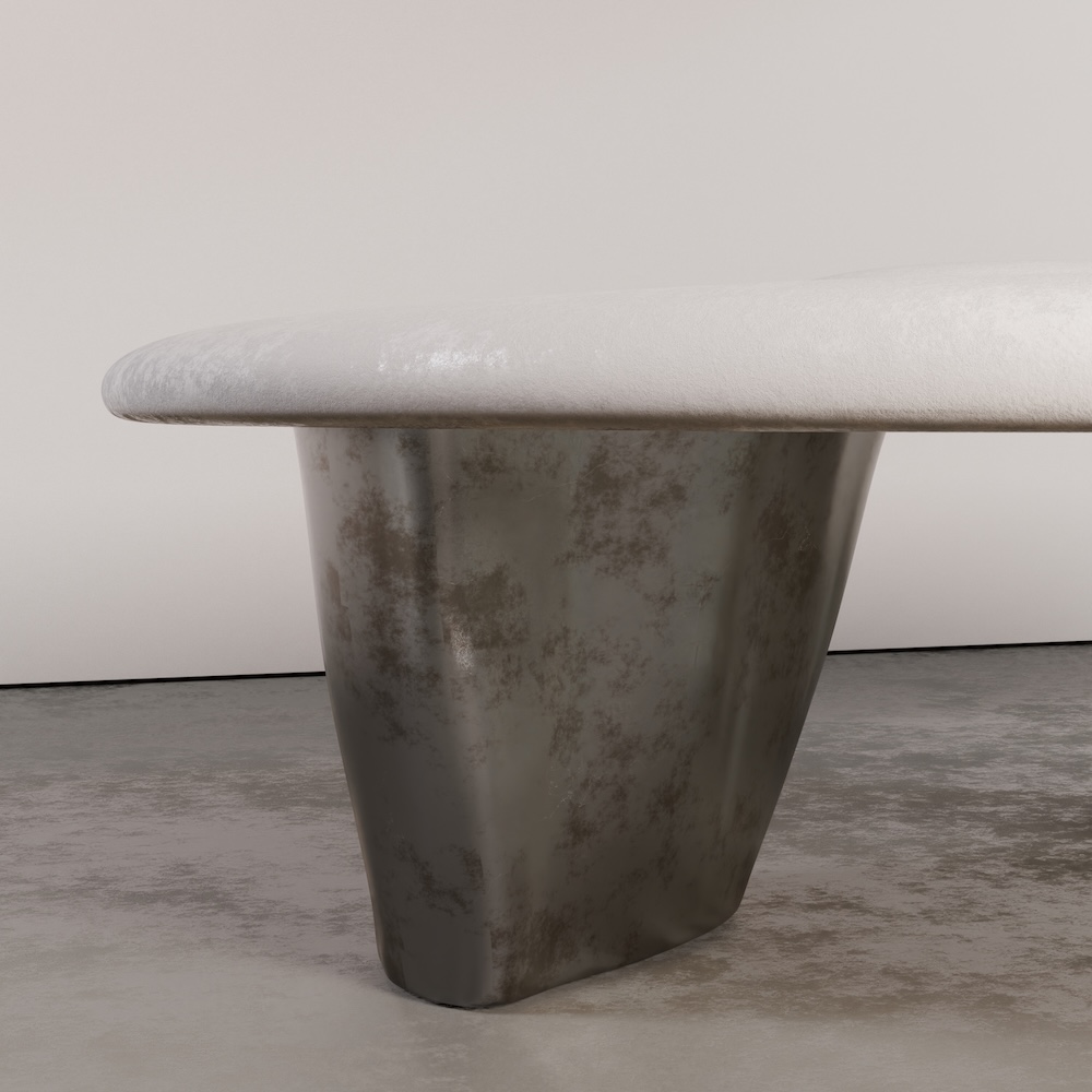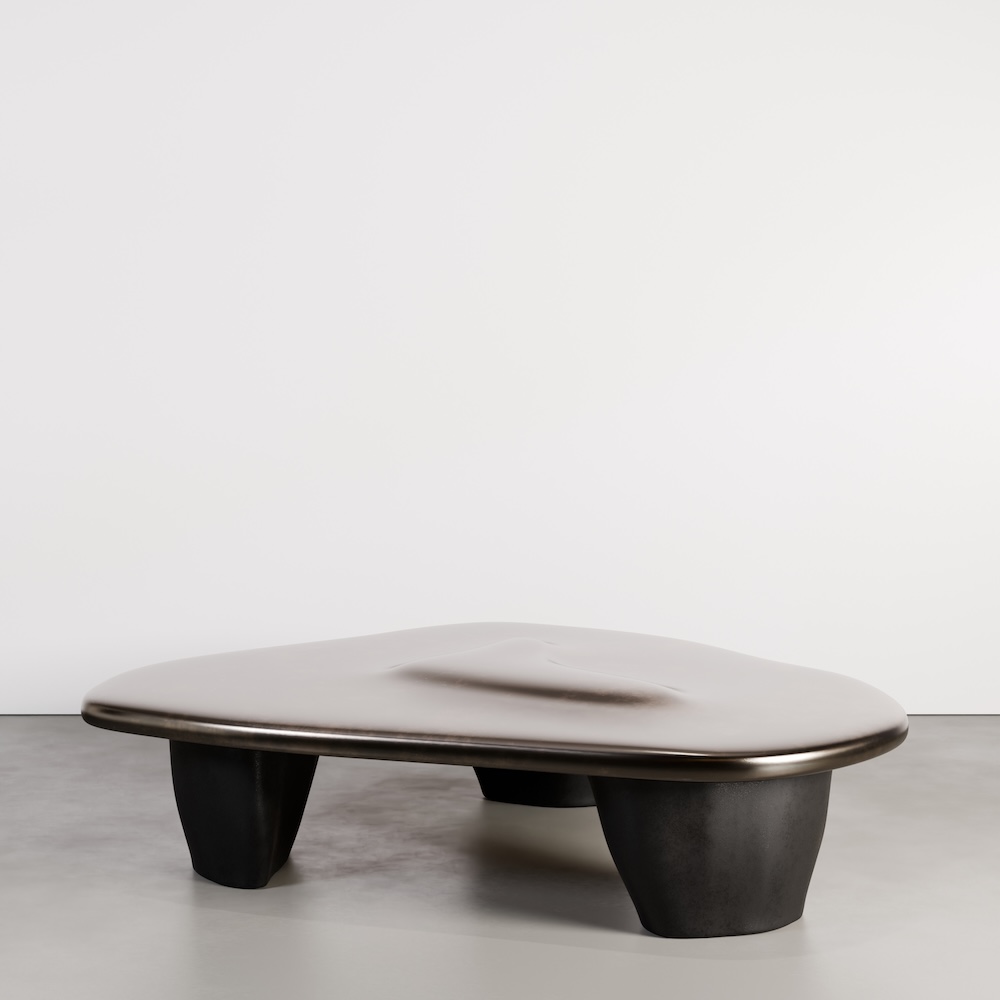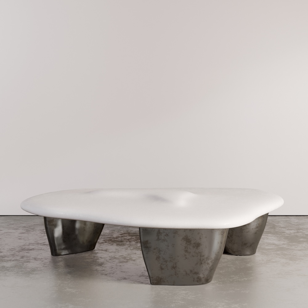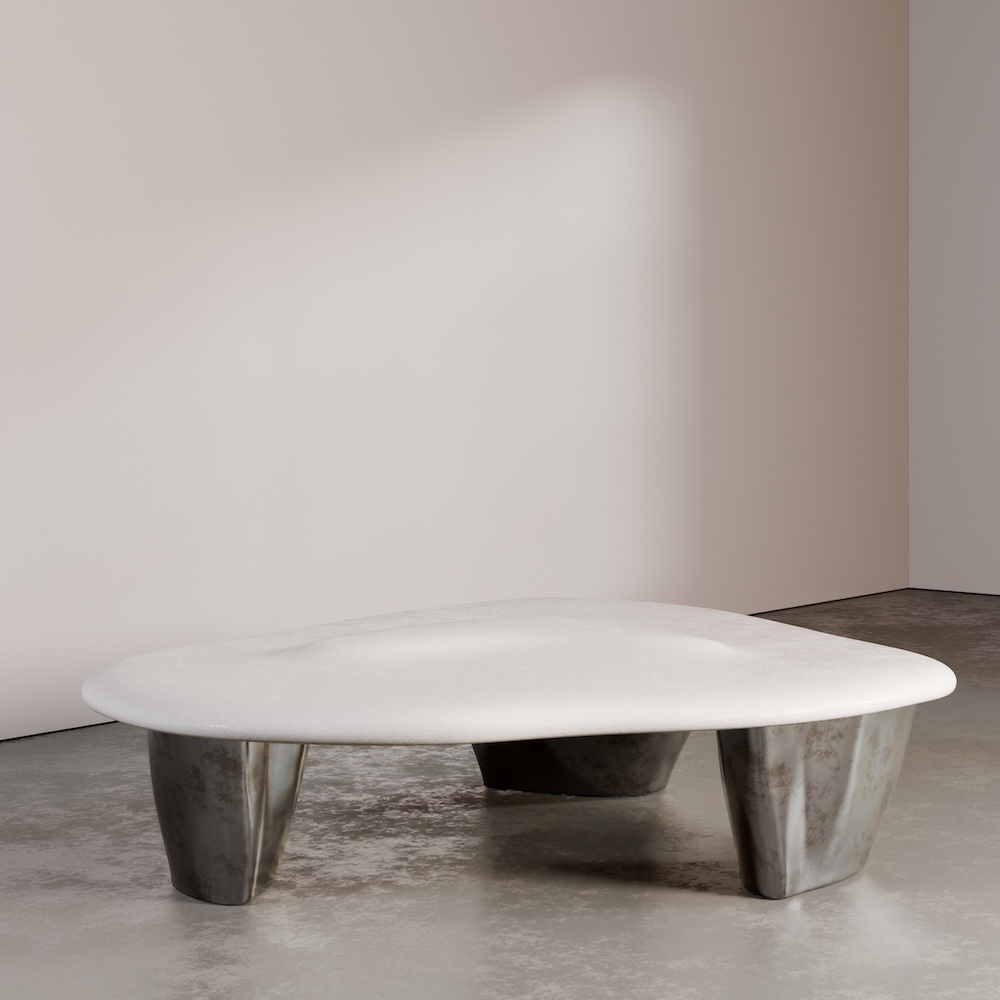 The Pollux coffee table pairs a softly contoured Marmorino plaster top with substantial liquid metal legs, creating a grounded yet fluid silhouette. The organic geometry of the top contrasts beautifully with the weight and texture of the metal base, resulting in a sculptural presence that feels both refined and architectural.