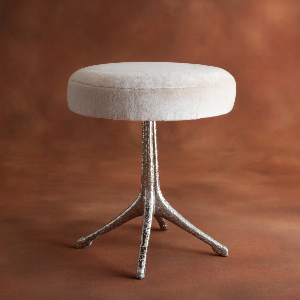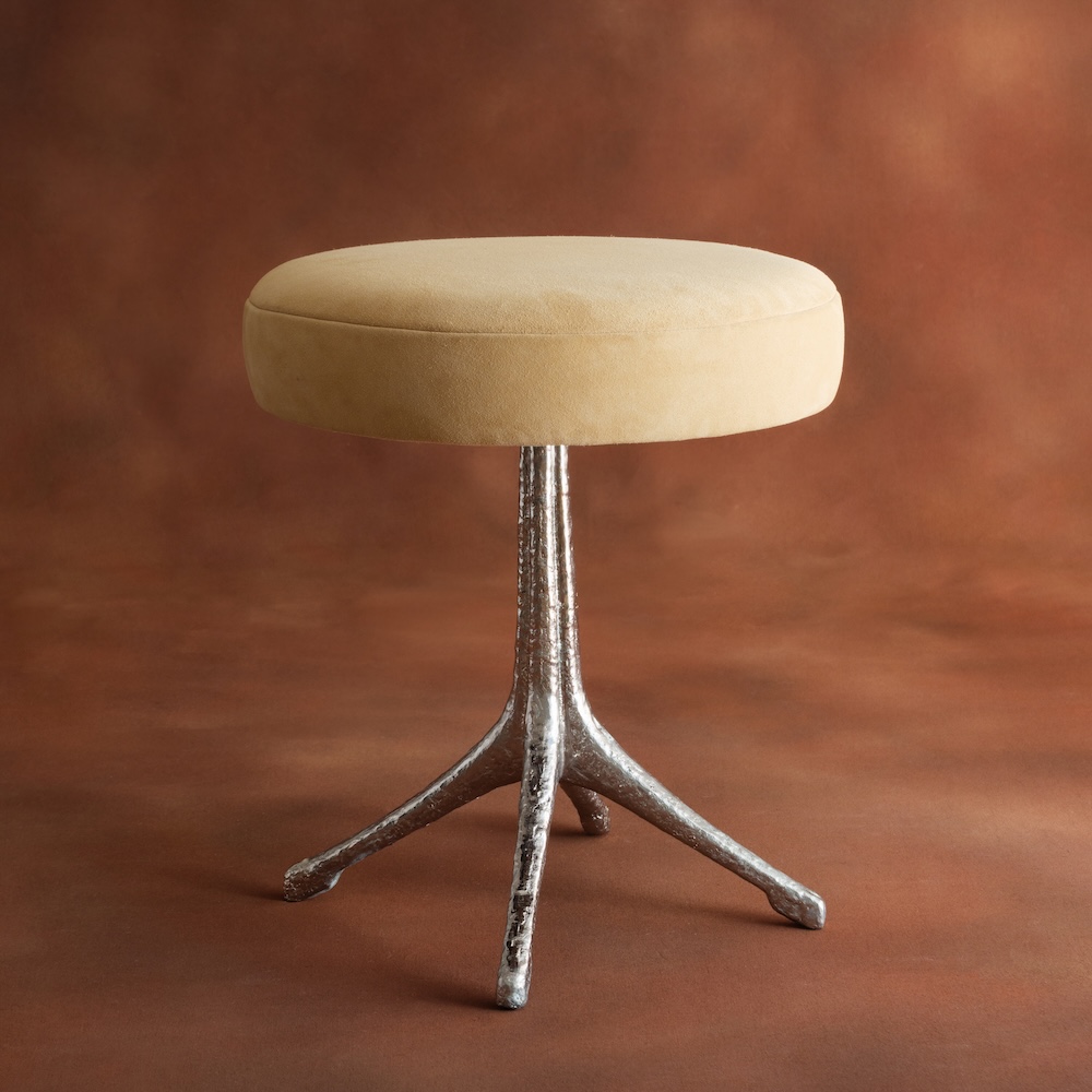 The Robin stool collection pairs sculptural metalwork with a refined upholstered seat, creating a piece that feels both artistic and functional. The base is cast in bronze with an elegant branching form that gives the stool a distinctive presence while maintaining a light visual profile. The upholstered seat can be specified in COM or COL, allowing the piece to adapt easily to a wide range of interiors while highlighting the character of the bronze base.