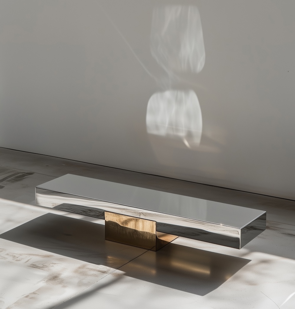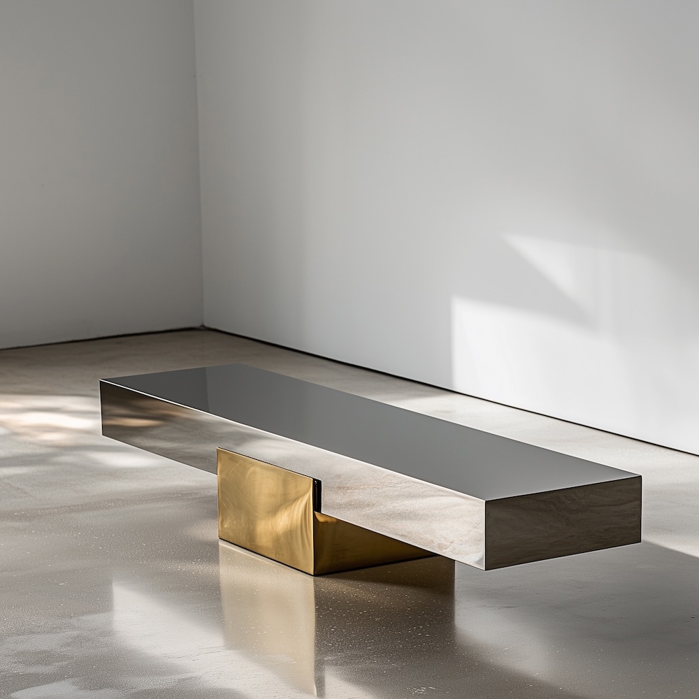 The X Bench explores a refined balance of weight and lightness through a clean architectural form. A polished metal seat appears to float above a sculptural base, where contrasting materials create a strong yet minimal gesture. The interplay between stainless steel and brass gives the piece a quiet presence while still feeling intentional and grounded.